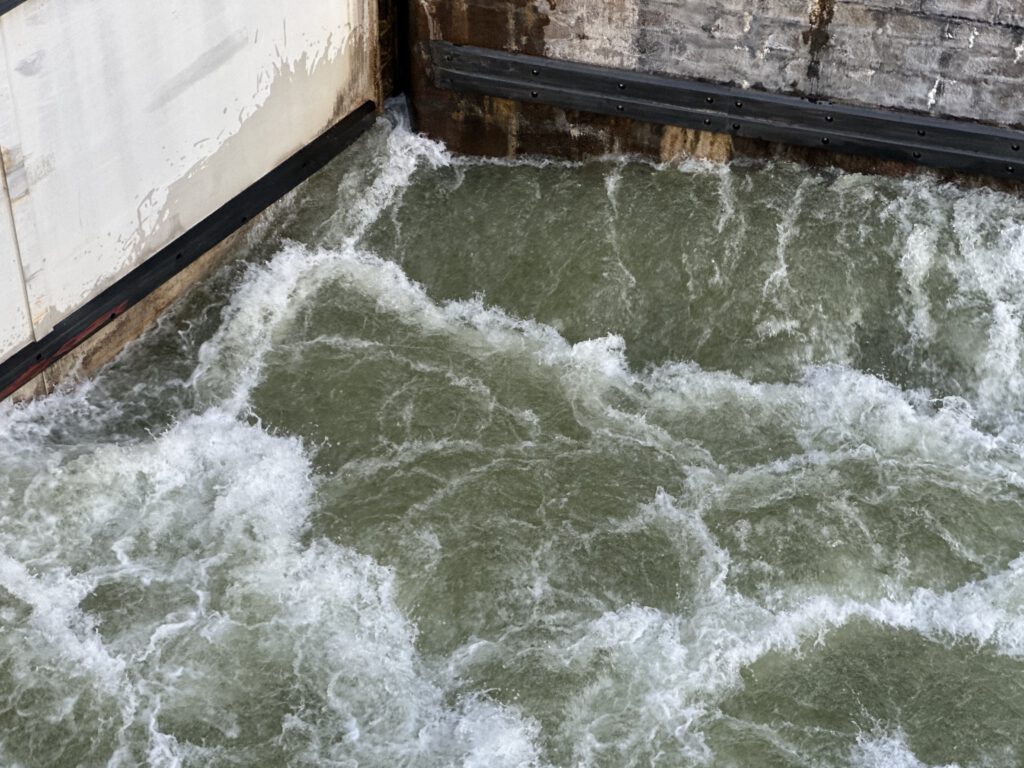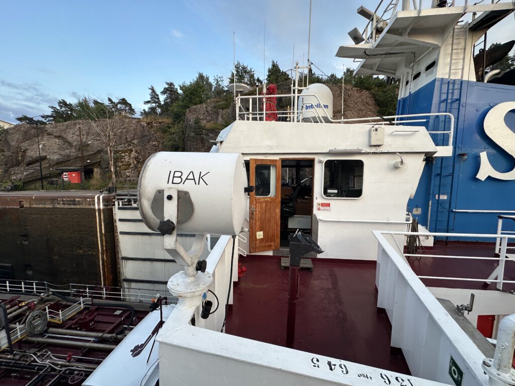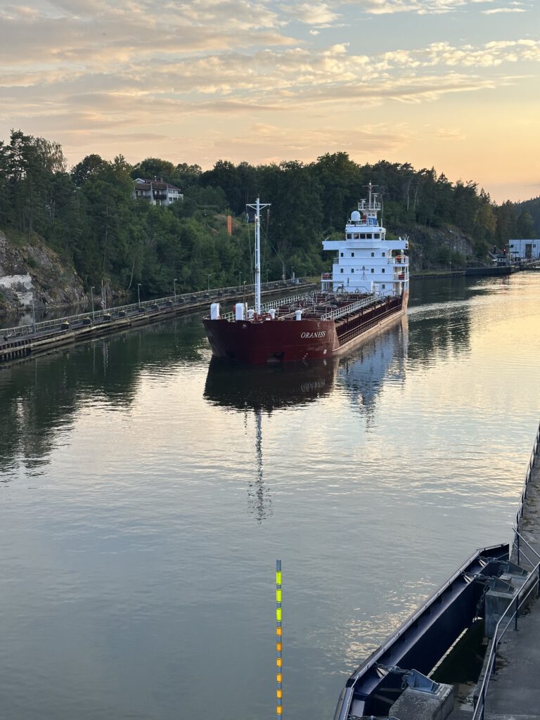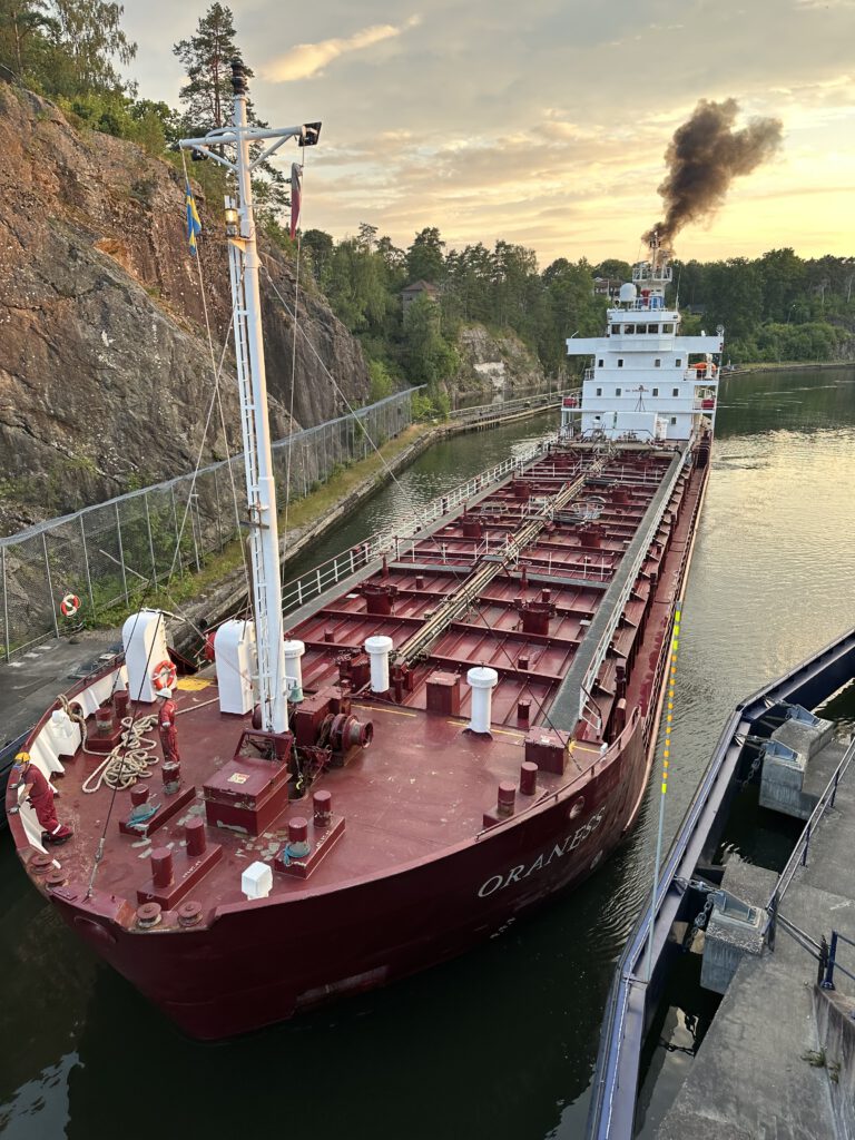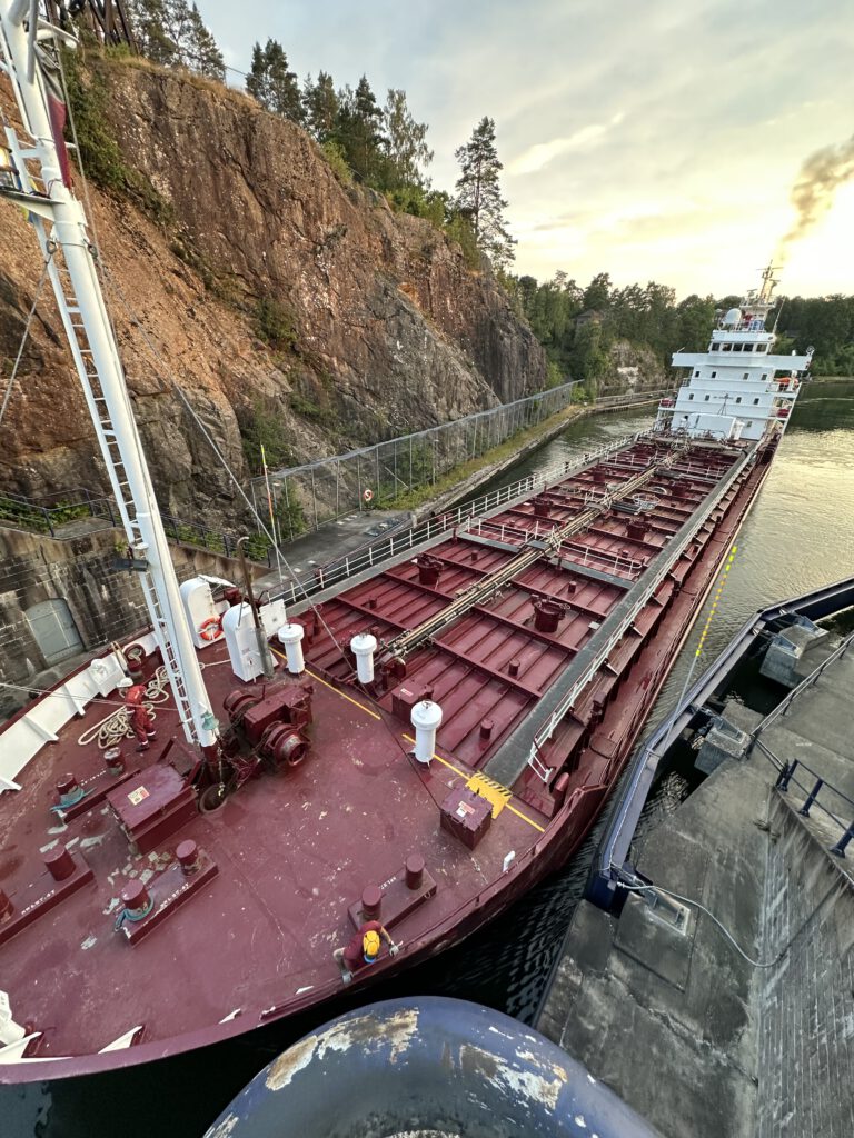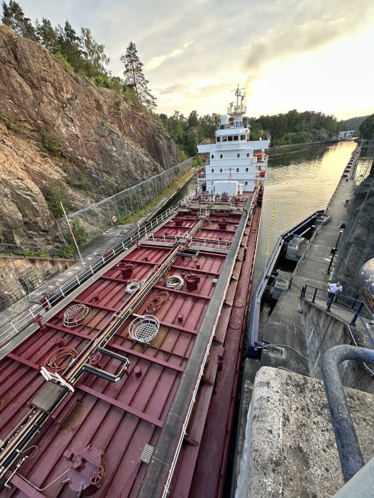 Abends zeigt das AIS, dass ein Frachter die Schleusentreppe hochkommt. Ich mache mich frühzeitig auf den Weg zur Schleuse – und es wird ein echtes Schauspiel. Auch wenn die Umweltbelastung solcher Transporte sicher kritisch zu sehen ist, ist es trotzdem faszinierend, so ein großes Schiff durch die engen Kammern manövrieren zu sehen.