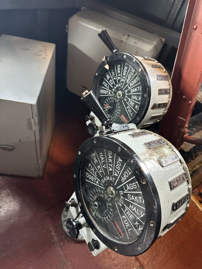 Zum Schluss geht es auf die Flodsprutan II, ein altes Feuerlöschboot, das früher im Göteborger Hafen im Einsatz war. An Deck stehen noch große Wasserwerfer und Schlauchanschlüsse, auch der Maschinenraum mit seiner alten Pumpentechnik ist zugänglich.