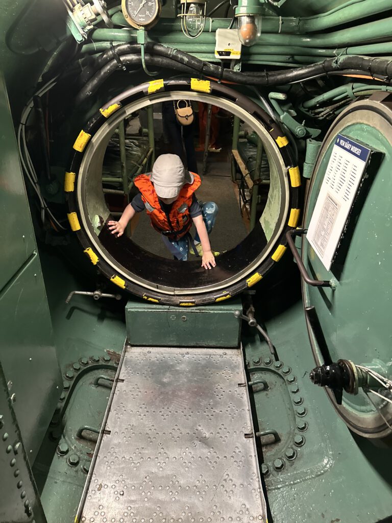 Danach steigen die beiden über eine schmale Luke in die Nordkaparen, ein U-Boot aus den 1960er Jahren. Im Inneren wird es deutlich beengter: Niedrige Decken, enge Schotten, alles auf engstem Raum. Zu sehen gibt es unter anderem die Torpedorohre, kleine Schlafkojen und sogar die winzige Kombüse – vieles wirkt noch weitgehend im Originalzustand erhalten.