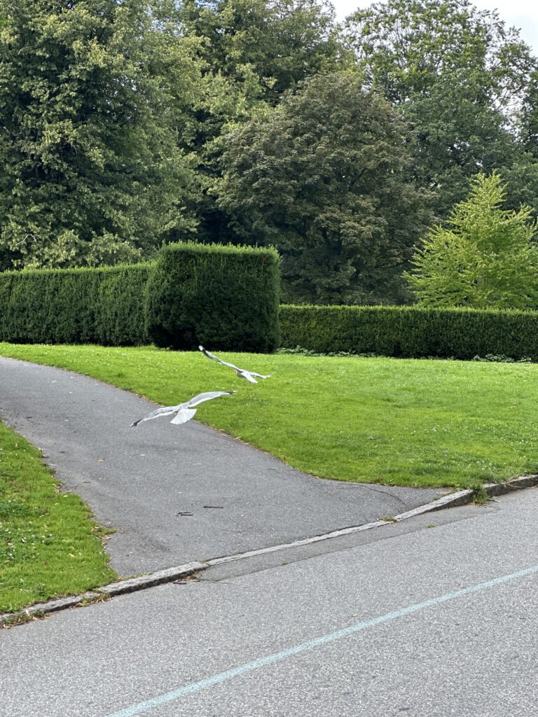 Diese Möwe rechts hatte einen pinken Flummi gefunden und hatte sich in den Kopf gesetzt, dass dieser irgendwie lecker aussehen würde. Bevor sie ihn schlucken konnte, rannte Paul hinter ihr her und sie ließ ihn voll Schreck fallen.