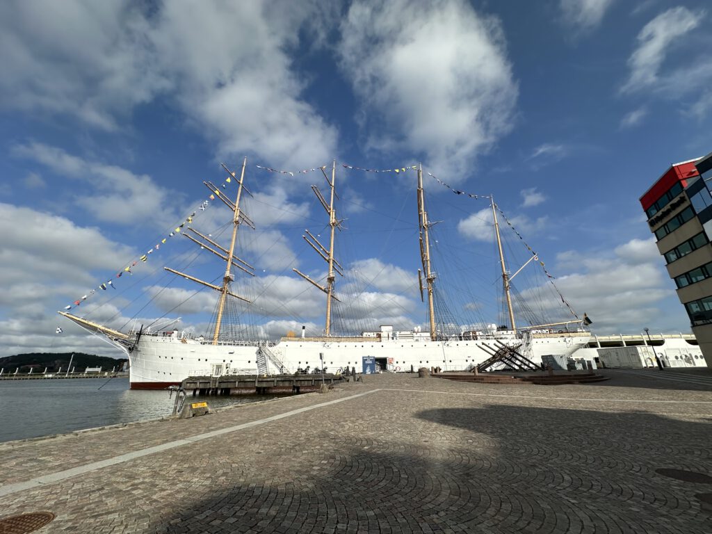 Danach treffen wir Paul auf dem Boot und wir müssen einmal umlegen, weil unser Platz bereits gebucht wurde. Immerhin kann uns der Hafenmeister helfen (er legt dafür zwei kleine Plätze zusammen), und diesmal zahlen wir für die Nacht nur 400 SEK. Hier im Göteborger Hafen Lilla Bommen (vielleicht ist es auch in anderen Häfen hier in der Stadt so), der sich am bekannten Lipstick Gebäude befindet (das Hochhaus mit den roten oberen Etagen, welches aussieht wie ein Lippenstift), gibt es eine Besonderheit, die wir noch nie hatten auf unserer Reise, nicht mal in Stockholm: Viele Segler, die hierherkommen, waren schonmal hier oder haben davon gehört, dass es besser sei, einen Liegeplatz im Voraus zu reservieren. In diesem Hafen können tatsächlich alle Liegeplätze im Voraus reserviert und bezahlt werden. In den meisten Häfen, in denen wir bislang waren, gab es vielleicht 5-10 Plätze, die über Dockspot.com vorab gebucht werden konnten. Nach unseren zwei ersten Nächten hier, können wir keine 3. Nacht buchen – und auch alle anderen Liegeplätze sind weg. Ein Glück ist der Hafenmeister aber flexibel und hilft uns weiter. Das Kuriose ist, dass zu 12 Uhr also viele Schiffe ablegen, dafür andere in den Hafen einfahren und andere Schiffe, die noch bleiben wollen, zu anderen Plätzen umlegen wollen – das Schiffstetris beginnt (12 Uhr ist hier die späteste Uhrzeit zum Verlassen des Liegeplatzes).