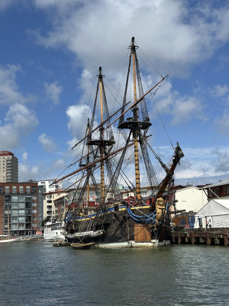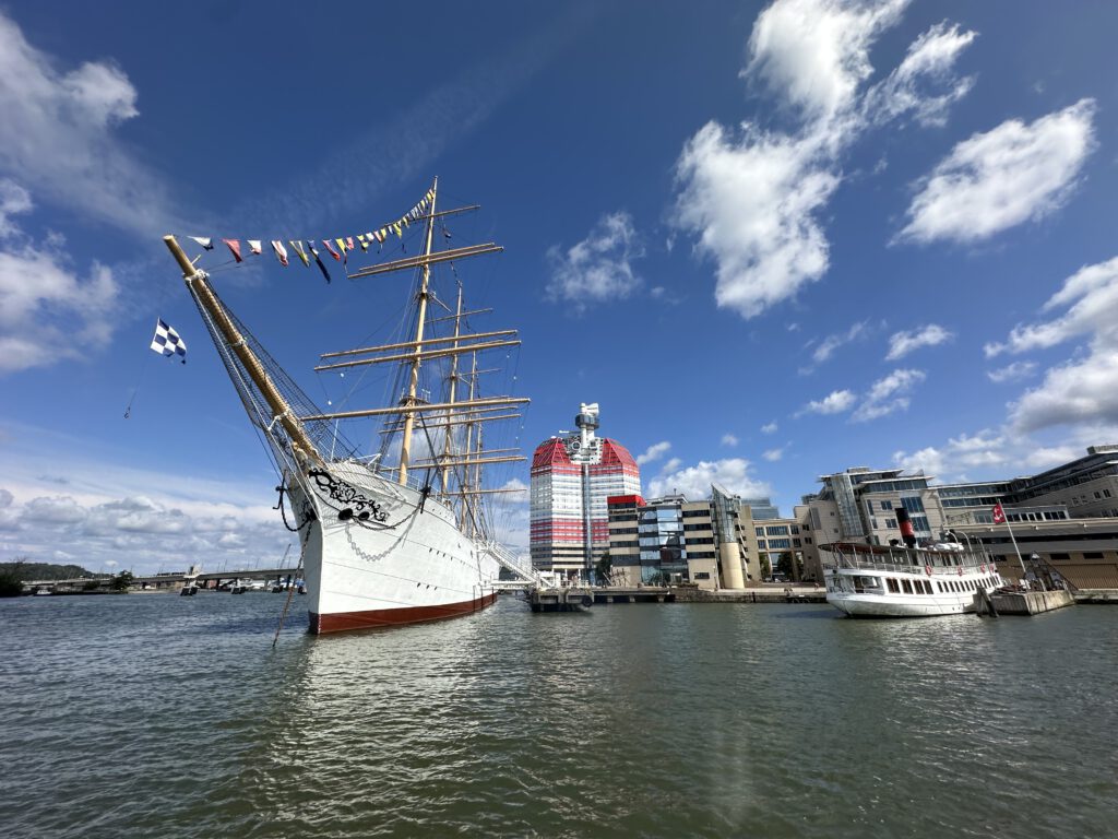 Wir haben Glück und die „Nachmieter“ für unseren Liegeplatz sind schon deutlich vor 12 Uhr da und weichen gegenüber auf einen freien Liegeplatz aus und so wird uns durch den Hafenmeister noch mehr Zeit gegeben, um ohne Stress abzulegen. Die anschließende Ausfahrt aus Göteborg ist für uns nochmal ein schönes Erlebnis, wir sehen, wieviele Häfen Göteborg eigentlich hat und sogar ein Piratenschiff liegt in einem Hafen.