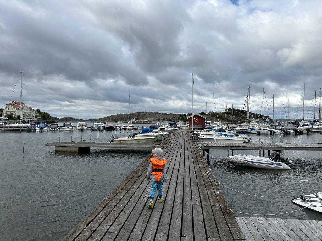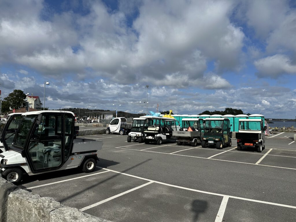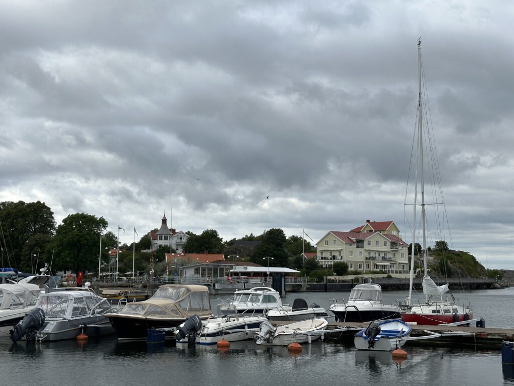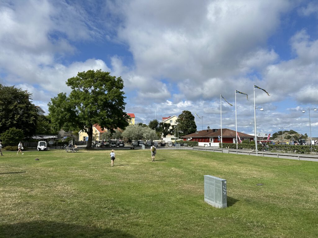 Bei der Recherche über lohnenswerte Schärenziele direkt vor Göteborg stoßen wir auf Styrsø, eine niedliche Insel mit Fähranleger zu einigen anderen Schäreninseln, einem großen Altenheim direkt am Hafen, einem super Spielplatz, auf dem wir dann täglich sind und per se „autofrei“. Man sieht nur ein paar wenige Autos, die scheinbar vom Festland stammen, wie z.B. vom Energieversorger. Ansonsten fahren hier Caddys rum (tatsächlich aber auch ziemlich zackig unterwegs) und Lasten-Motorroller.