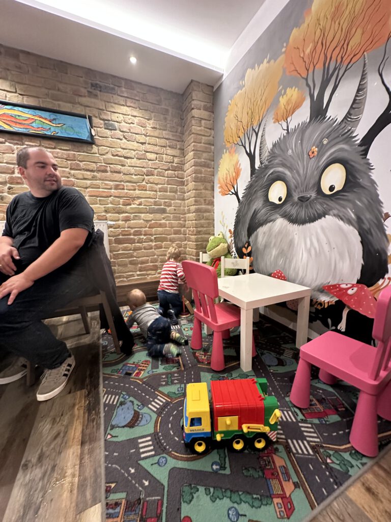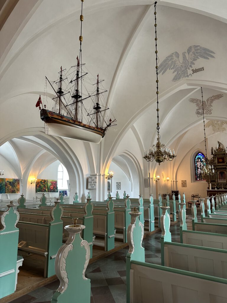 Sie erzählt uns auch, dass die Bänke nicht mehr die originale Farbe haben und zur „Trauer“ von Kapitän Wirbelwind auch keine Türen mehr, die er so gern auf- und zumacht =)Wieder ein „Fahrstuhl“ für den schweren EinkaufskorbKunstausstellung in der KircheIm Hafen fährt auch eine Fähre nach Halmstad (Schweden)Nach der Rückkehr aus der Stadt: „Papa, ich möchte heute nochmal zu dem Spielplatz mit der Krake von gestern!“ „Äh, da können wir nicht nochmal hin, das kostet Eintritt, das tut mir leid.“(Anmerkung: Rd. 25 Euro Eintritt für einen Erwachsenen und ca. 14 EUR für ein Kind ab 3 Jahre sind doch für ein paar Minuten spielen und klettern relativ viel) „Aber da bin ich gestern nicht hochgeklettert, das möchte ich heute unbedingt noch machen.“ (…….) „Ok, pass auf, ich frage mal beim Einlass nach, ob du da heute nochmal klettern darfst.“
