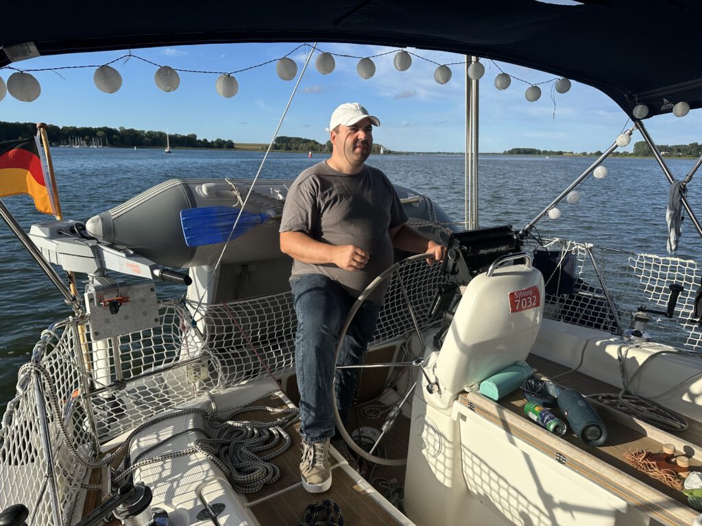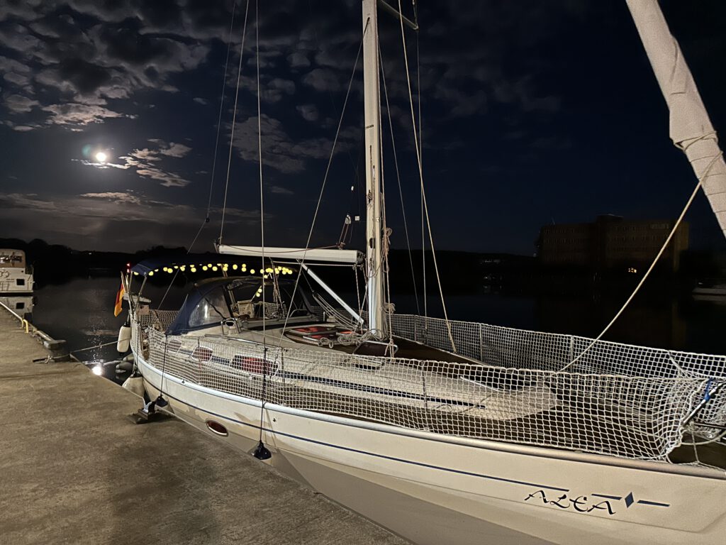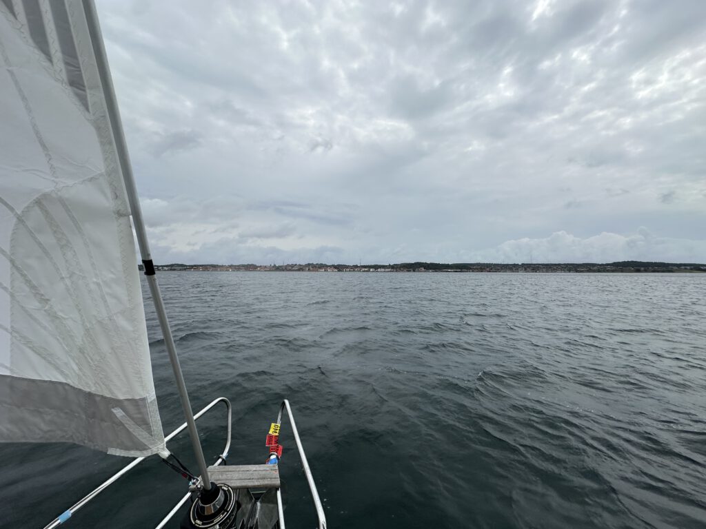 Heute geht es schon vor dem Frühstück los. Der Wind soll im Laufe des Tages abnehmen, deshalb heißt es früh starten. Zunächst segeln wir mit Genua und Groß Richtung Stralsund. Schon bald entscheide ich mich, von der Genua auf den Genacker zu wechseln – ein etwa doppelt so großes Segel, das bei leichtem Wind von der Seite oder von hinten eingesetzt werden kann. Den Wechsel mache ich einhand, nach 3–5 Minuten steht das Segel.