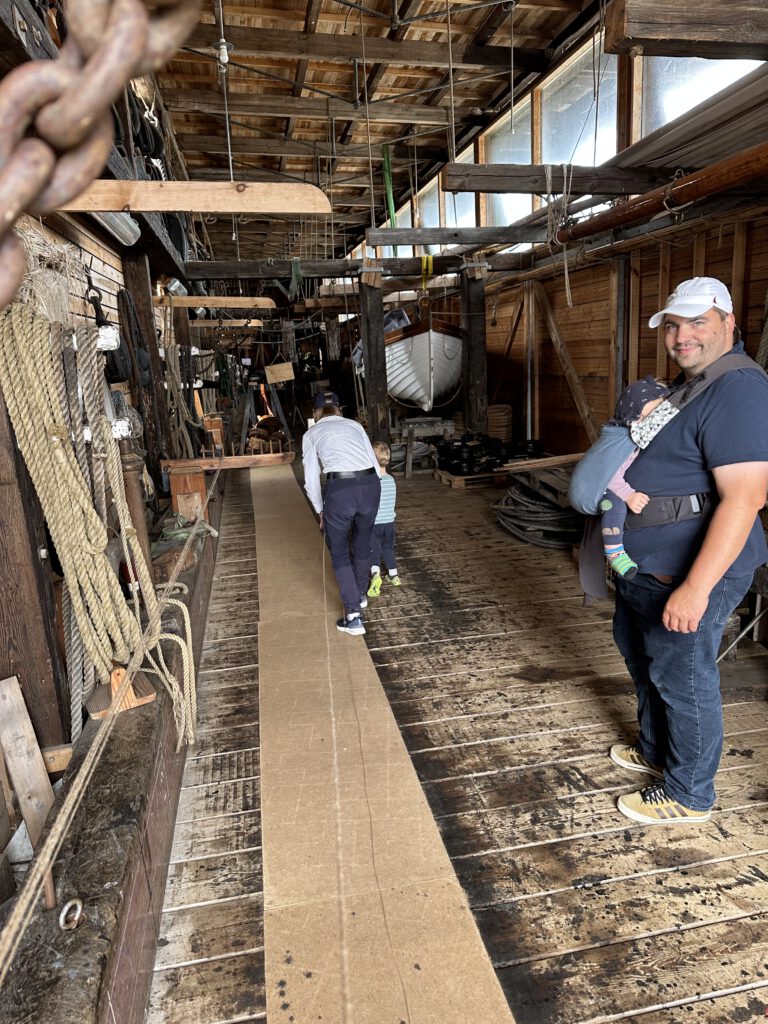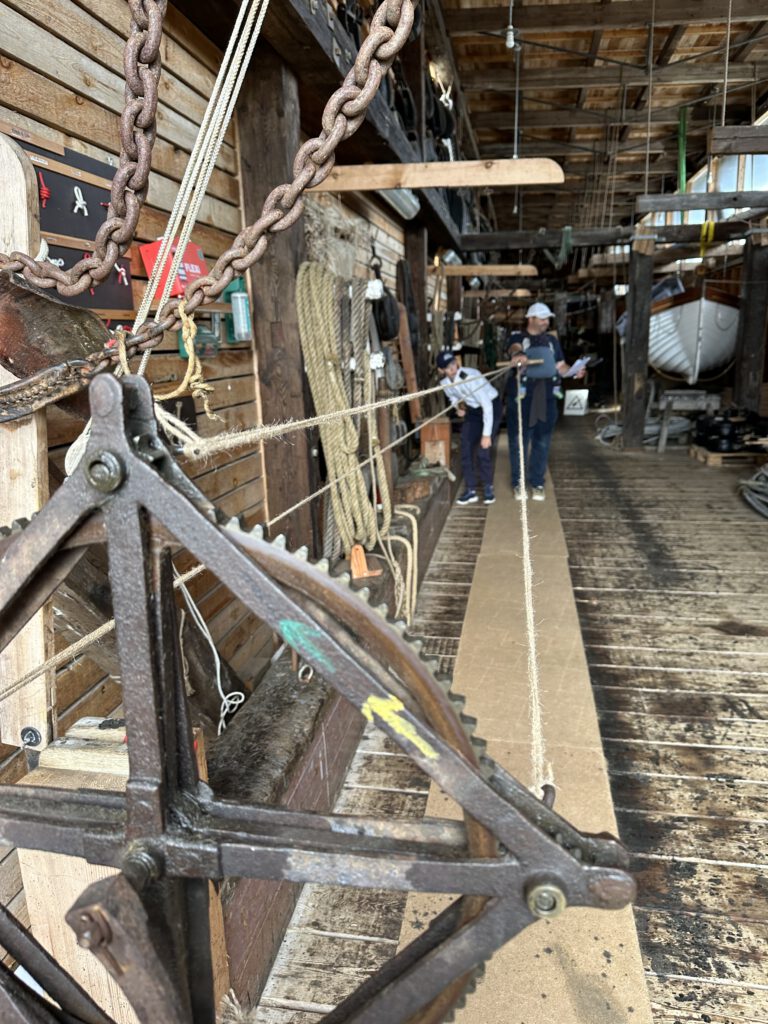 Im Shop des Glasmuseums, wunderschöne Glaskunst!Die Reeperbahn – wo die Seile hergestellt werdenDer KompassNachstellung einer Amputation eines schwer verletzten BeinsGanz schön schwer! Wir bekommen die Winsch grade so bewegt