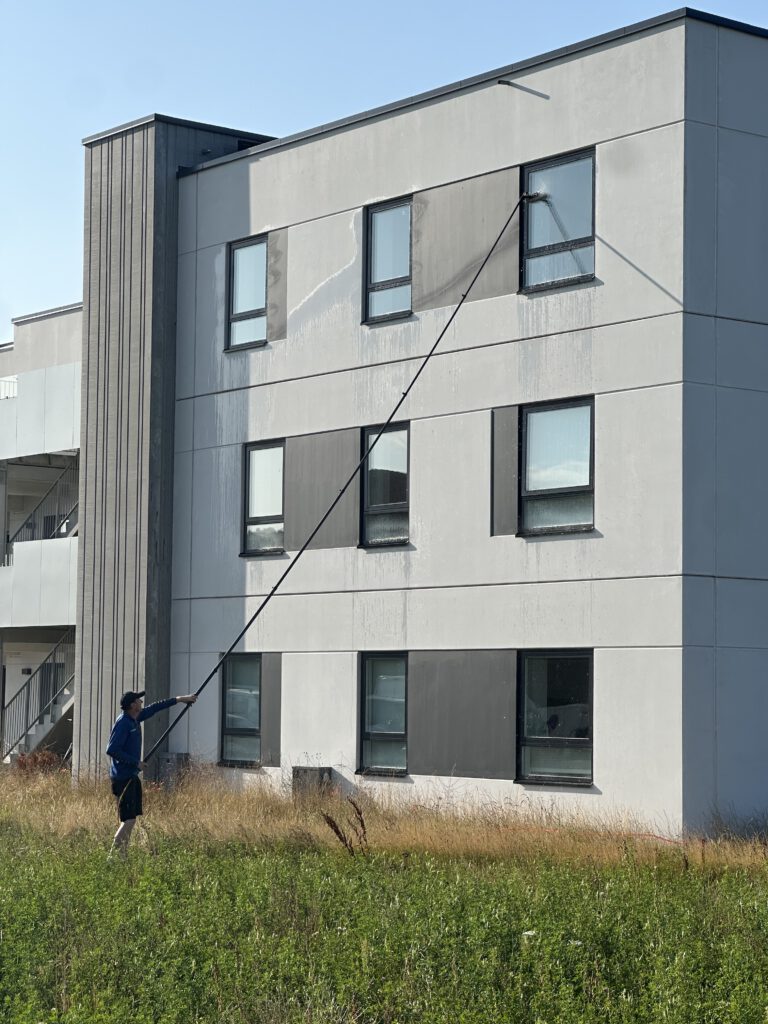 Morgens um halb 9 in Ebeltoft: Während Mama noch nicht richtig wach ist (vielleicht sollte ich doch mal anfangen, Kaffee zu trinken???) … und Papa beim Supermarkt Brot oder Brötchen fürs Frühstück besorgt, flitzt der Kleinste schon über die Wiese und klettert der Größere über den SpielplatzWow, Fensterputzen in der 2. Etage von außen ohne Gerüst… Sogar mit Dampfaufsatz!Derweil bei Paul im Supermarkt: „Kinder, seid brav und esst Obst, während eure Eltern einkaufen.“ Das ist ja mal nett!Nochmal Pizza- aber wir sind auf Samsø und hier gibt es Kartoffelpizza, die wir vorher noch nirgendwo bekommen haben. Lecker!