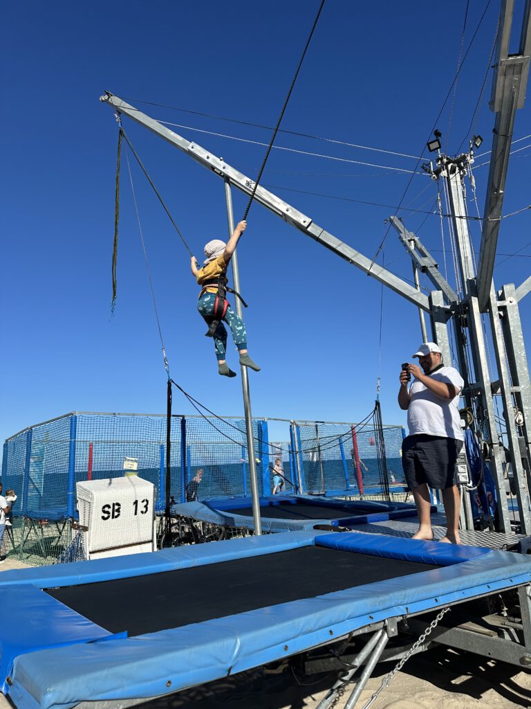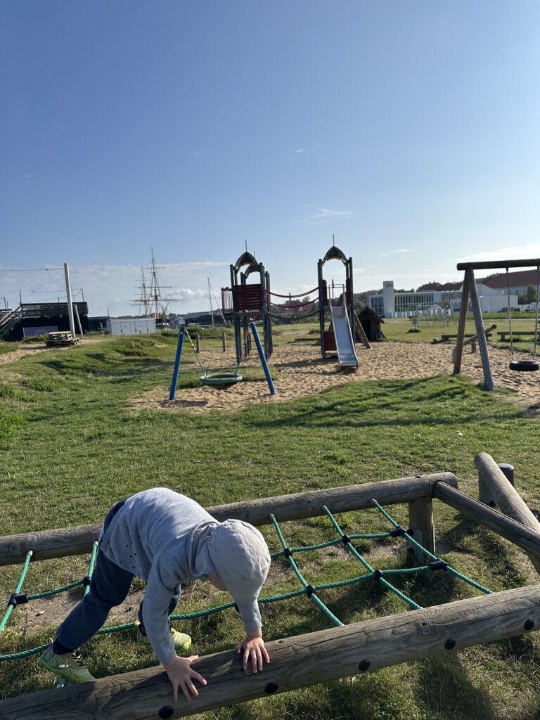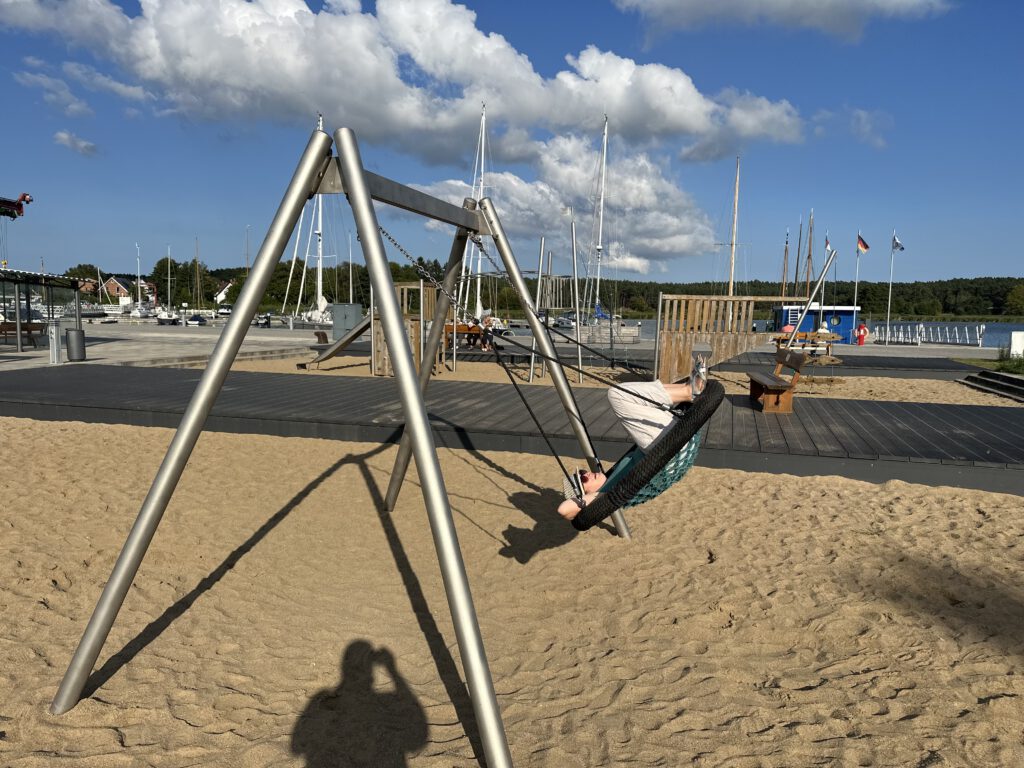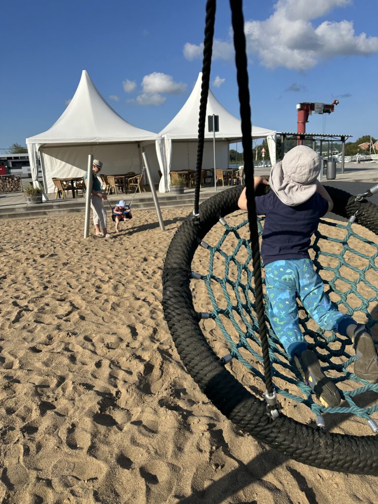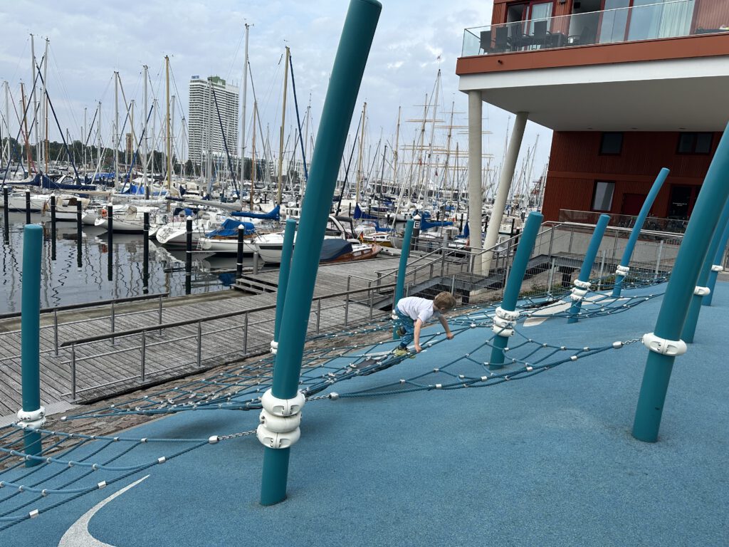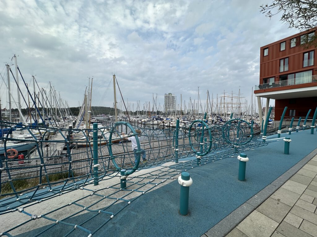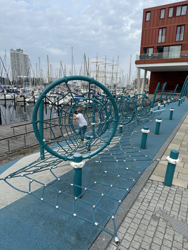Dort machen wir im Passathafen fest. Oma und Opa erwarten uns, mit einem Fischbrötchen in der Hand. Der Kletterspielplatz direkt am Hafen wird erkundet, danach die Fewo von Oma und Opa und der nächste Spielplatz am Hafen mit Wasser(plansch)becken.