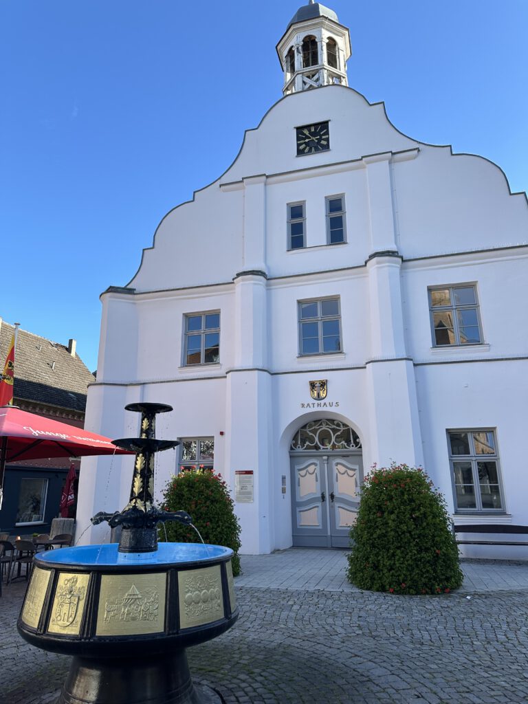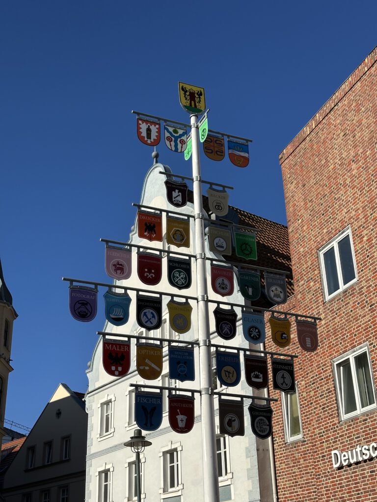 Ich laufe morgens mit dem Mini Matrosen hoch zum Marktplatz zum Bäcker Was für ein schönes Rathausgebäude !Sind dies alle Gewerke, die in Wolgast ansässig sind ?
