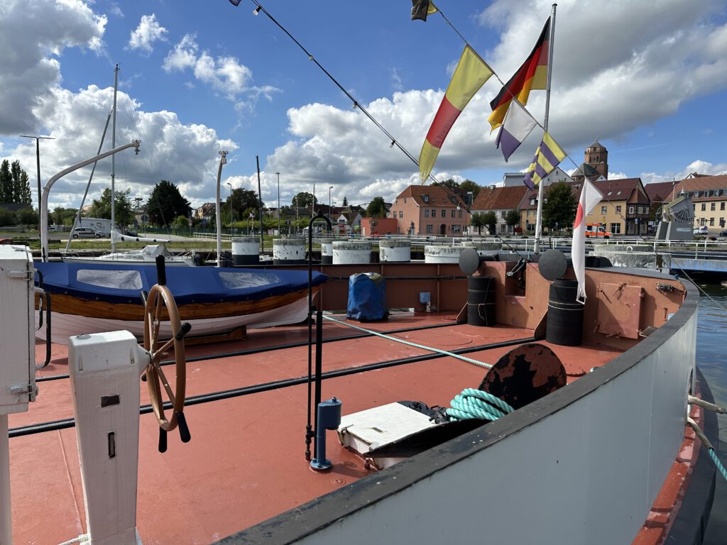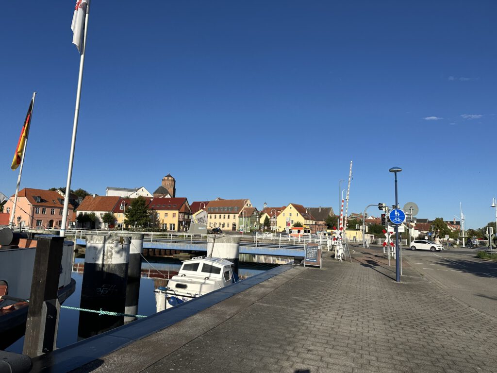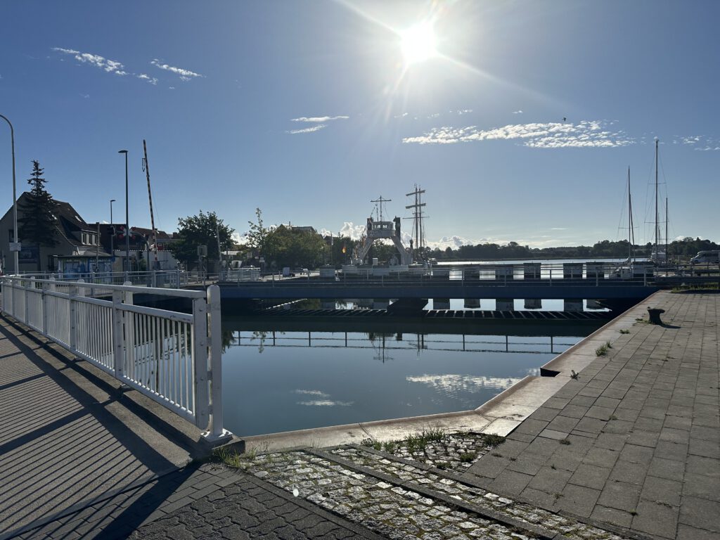 Vor der Brücke in Wolgast ankern wir, da diese erst um 17:45 öffnet. Direkt dahinter, auf der rechten Seite, liegt der Hafen. Die Hafenmeisterei wurde zwar an einen neuen Hafenmeister übergeben, ansonsten ist hier aber alles beim Alten geblieben.