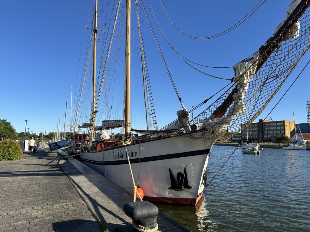 Es geht weiter südwärts. Wir überlegen, ob wir heute direkt zur Insel Samsø (relativ gerade runter) oder nach Ebeltoft (um einen Landhaken herum und ca. 1 h an diesem wieder hoch) fahren sollen. Kapitän Wirbelwind sagt spontan: Ebeltoft! und damit ist es entschieden. Ich hatte mir bei Google Maps den Ort wieder vorab angeschaut und war mir sicher, das wäre was für eine Nacht, ggf. sogar 2-3, wenn dies erforderlich werden sollte. In dem einen von zwei Häfen in der Stadt liegt in unmittelbarer Nähe ein altes Holzkriegsschiff von 1860 – da bin ich mir der Begeisterung unseres Älteren sicher.