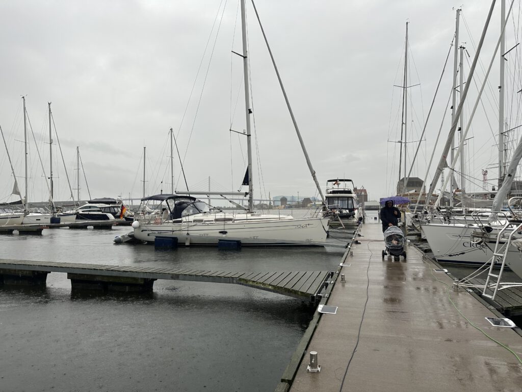 Viele Plätze sind belegt, ein paar sind noch frei, an denen jedoch „online buchbar“ steht. Ich suche online einen aus, der uns auch im wahren Leben gefällt, und wir legen an. Da begrüßt uns der Hafenmeister mit den Worten, hier könnten wir leider nicht liegen bleiben, der Platz wurde durch ein 14 Meter Schiff reserviert, das System könne dies aber leider nicht anzeigen. So ein Mist, hier hätten wir längsseits liegen können und das ist wunderbar, wenn man mit Baby und Buggy unterwegs ist. Er ist aber super freundlich, bittet um Entschuldigung und macht uns einen anderen Platz schmackhaft, von dem aus man es auch nicht weit hat zu den Sanitäranlagen und den Restaurants/ Cafés. Wir sagen zu und schon düst er mit seinem Lastenrad zu dem Platz und erwartet uns dort, um mir vorn die Leinen abzunehmen – natürlich auch wieder mit einem Lächeln. Sehr sympathisch. Ich sage, wir bleiben auch nur eine Nacht, weil wir weiter müssen und er kann es kaum glauben, dass jemand nach nur einer Nacht schon weiterfahren möchte. Im Laufe des Spaziergangs zum Hafenautomaten sowie zur Erkundung des Städtchens verstehe ich auch, wieso. Für mich steht schnell fest, hierher möchte ich gern zurückkommen. Samsø bleibt auf unserer Liste. Am Abend sehen wir eine Pizzeria und wir haben natürlich mal wieder nicht vorkochen können während der Fahrt (das Essen wäre zeitweise wohl durch die Luft geflogen), also setzen wir uns und lernen die bekannten Samsø’er Kartoffeln auf einer Pizza kennen. Auch das gern beim nächsten Mal nochmal =)