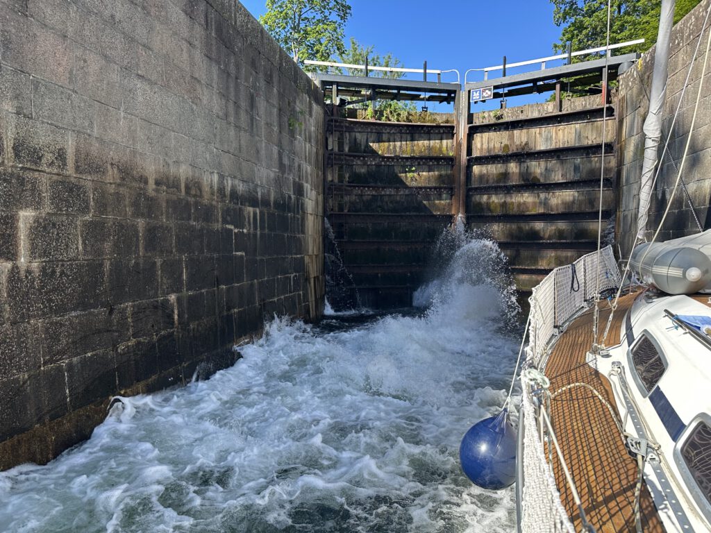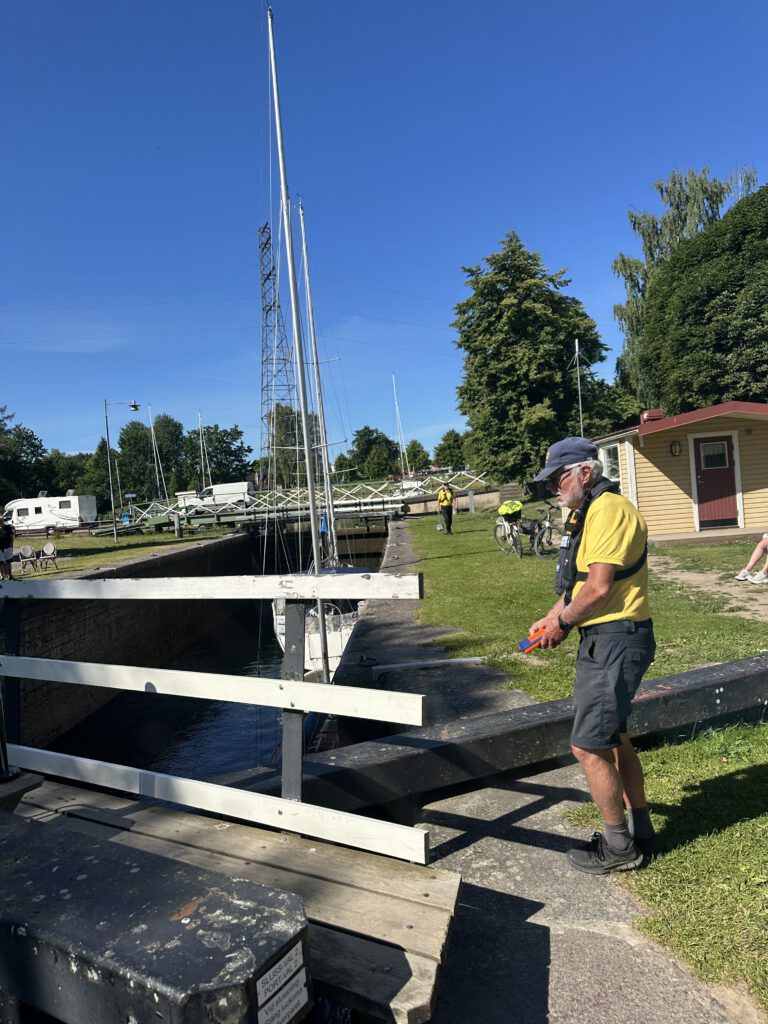 Die Schleusung klappt reibungslos und dauert für alle 5 Schleusen eine Stunde. Heute hat ein netter älterer Schleusenwärter Dienst, wir denken er ist sicherlich Rentner, der den Sommer über als Schleusenwärter arbeitet. Tolle Aufgabe, wie wir finden! Er sticht unter den zu einem sehr großen Teil sehr jungen Schleusenwärtern/ -wärterinnen definitiv heraus, die meisten machen diesen Job sicherlich als Studentenferienjob. Er ist sehr zuvorkommend und kümmert sich stets um unsere Achterleine (festmachen und lösen, tragen zur nächsten Schleuse).