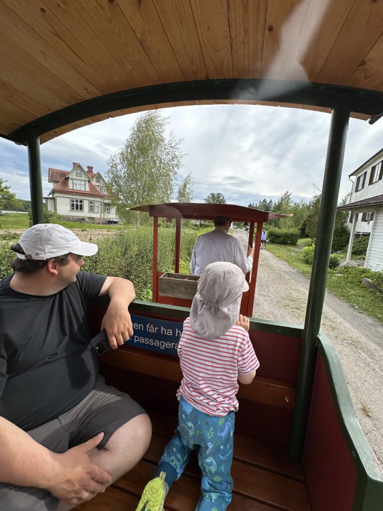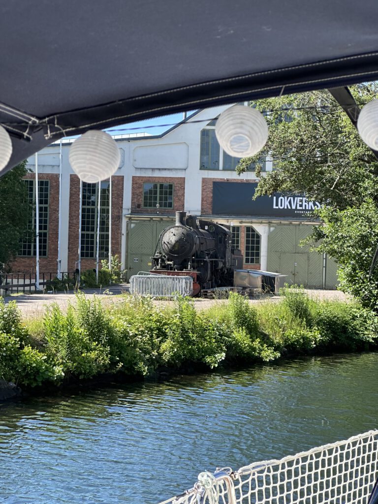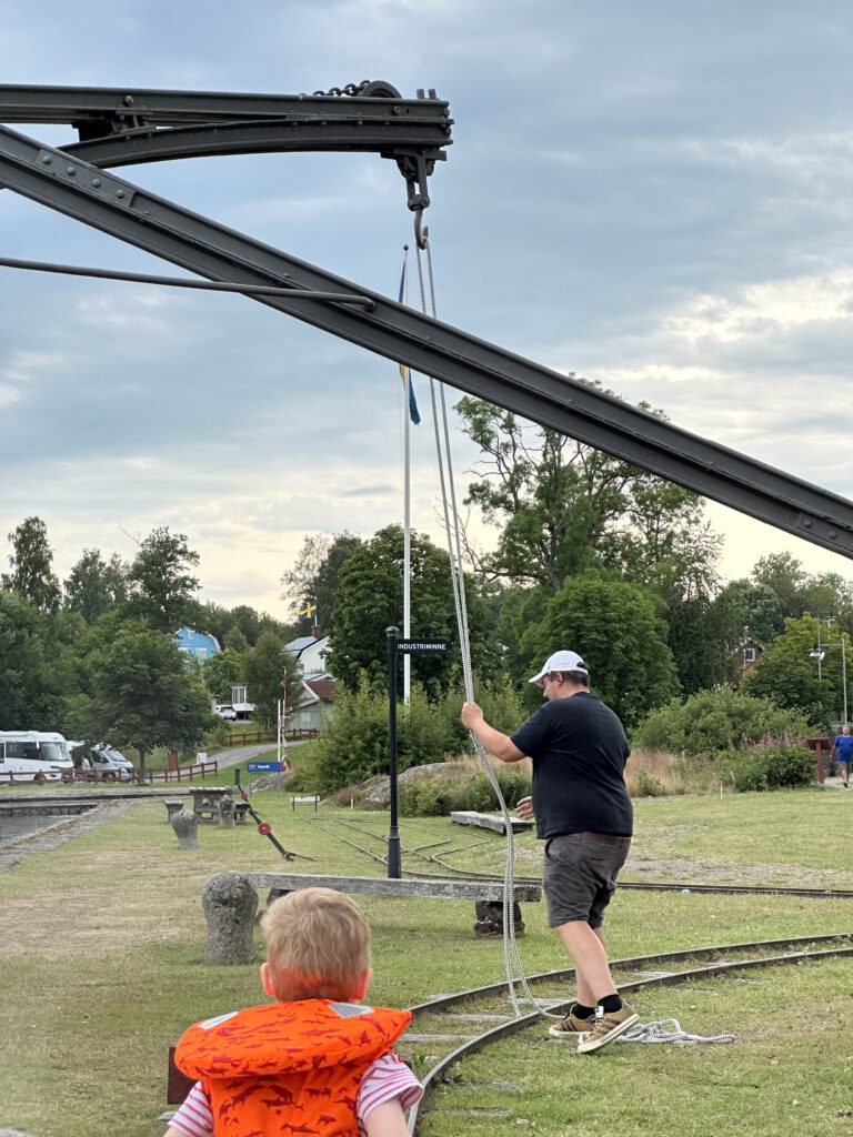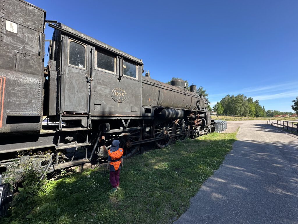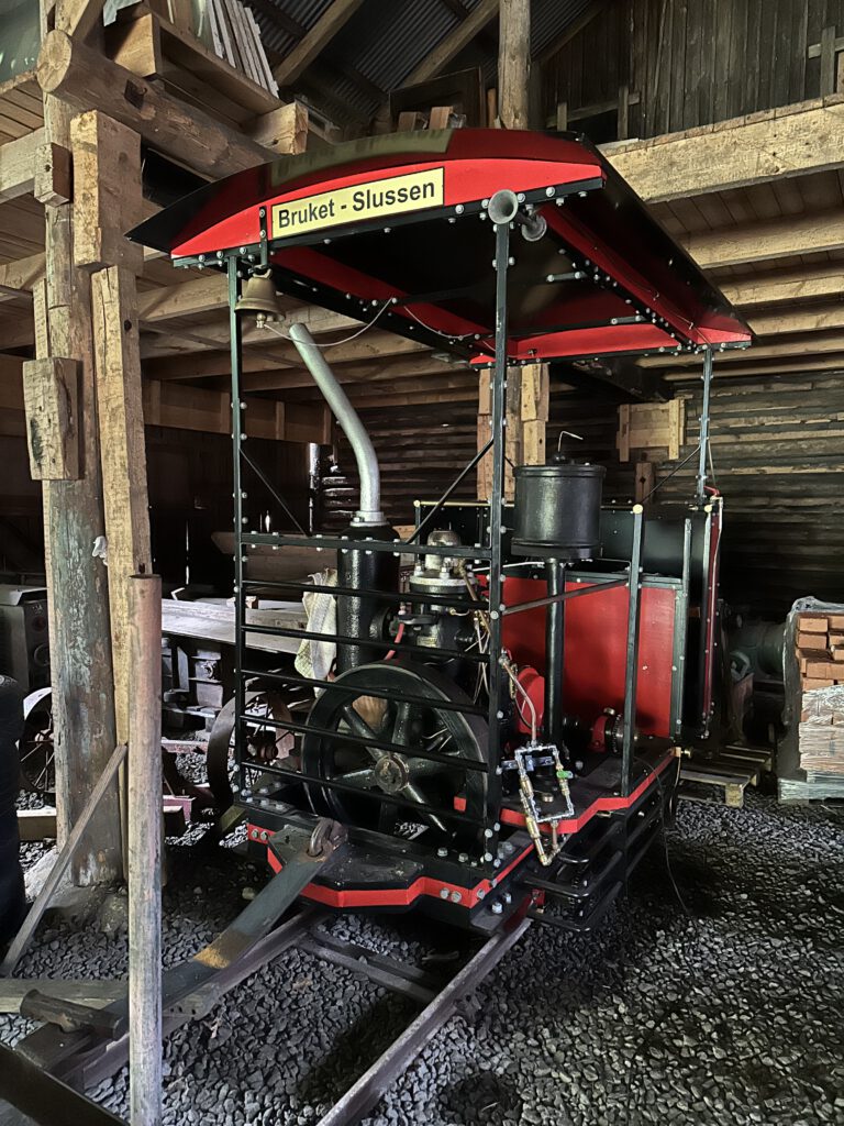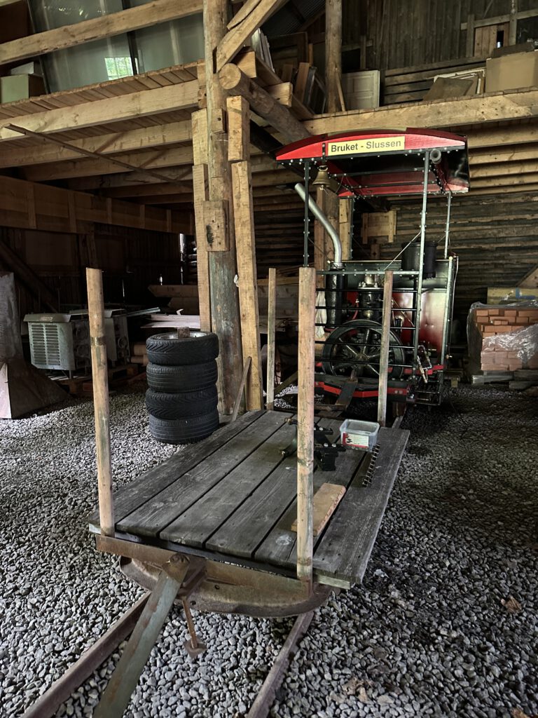 Schade, das war anders geplant. Nach einiger Zeit warten beschließen wir, zur Forsvik Bruk zu kaufen, keine 10 min vom Hafen entfernt. Hier laufen auch kleine Gleise vom Hafen bis zum Industriegelände und die beiden großen Männer sind fleißig dabei, die Weichen umzustellen und haben großen Spaß daran. Der Eisenbahnschuppen steht offen und so schauen wir uns um und sind etwas traurig, mit solch einer Bahn nicht fahren zu können, zumal noch Fahrtpreise dranstehen Vermutlich veraltet.
