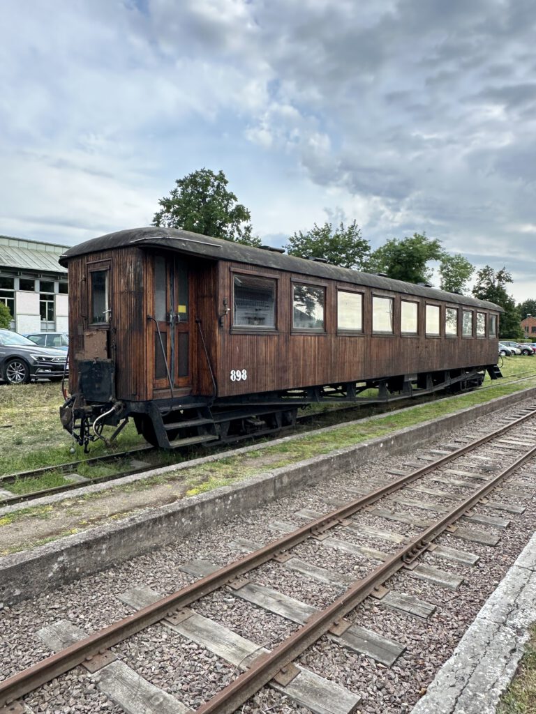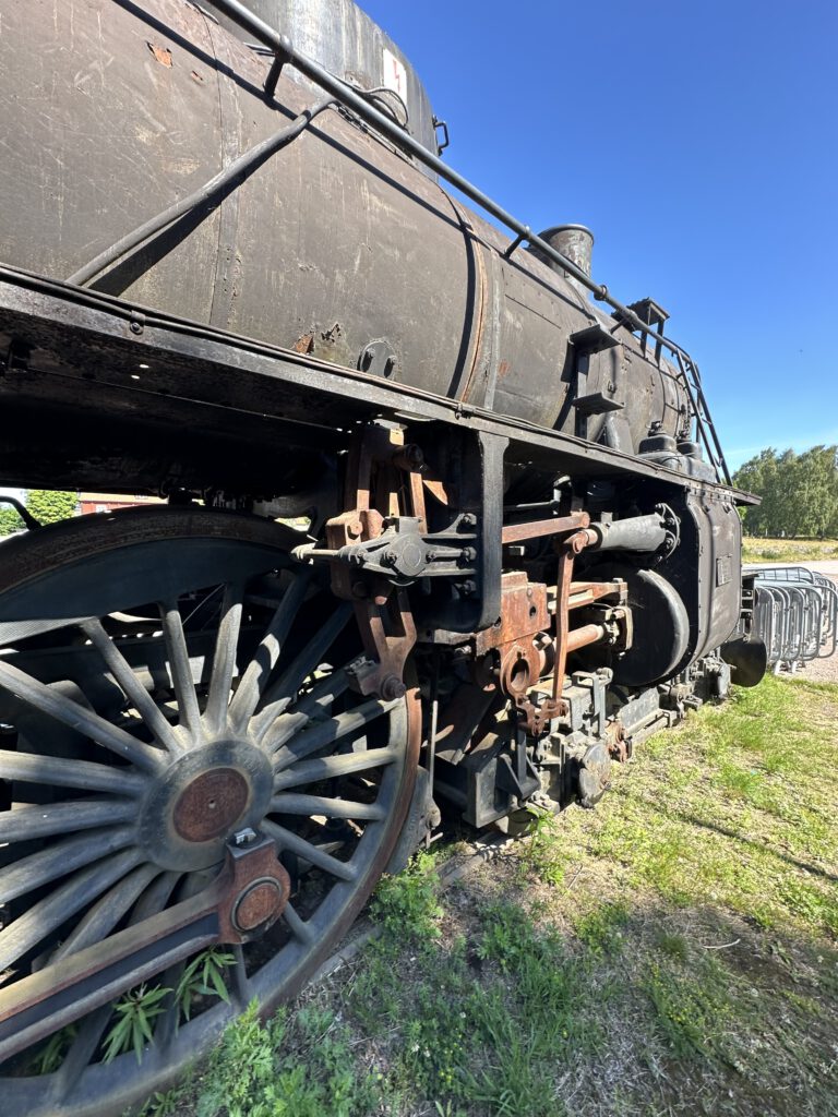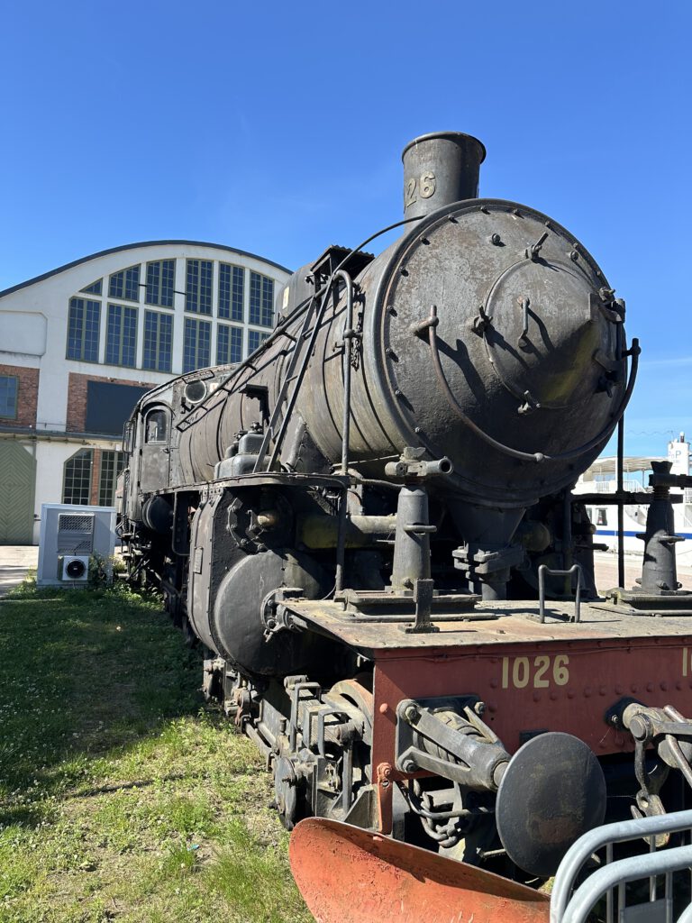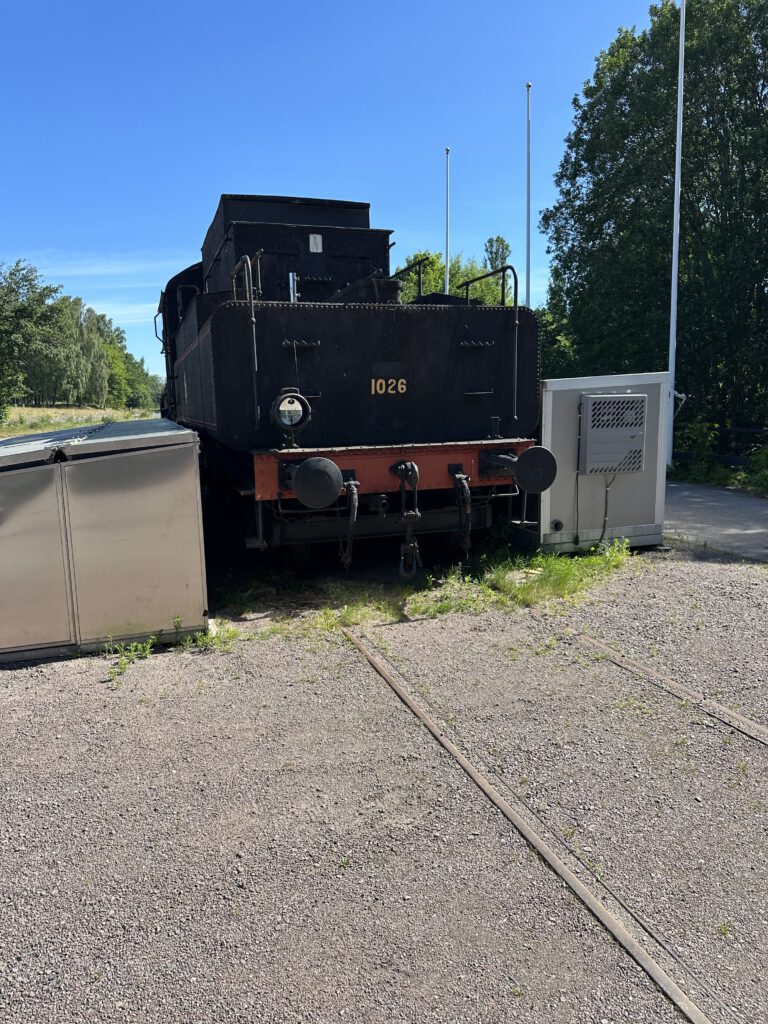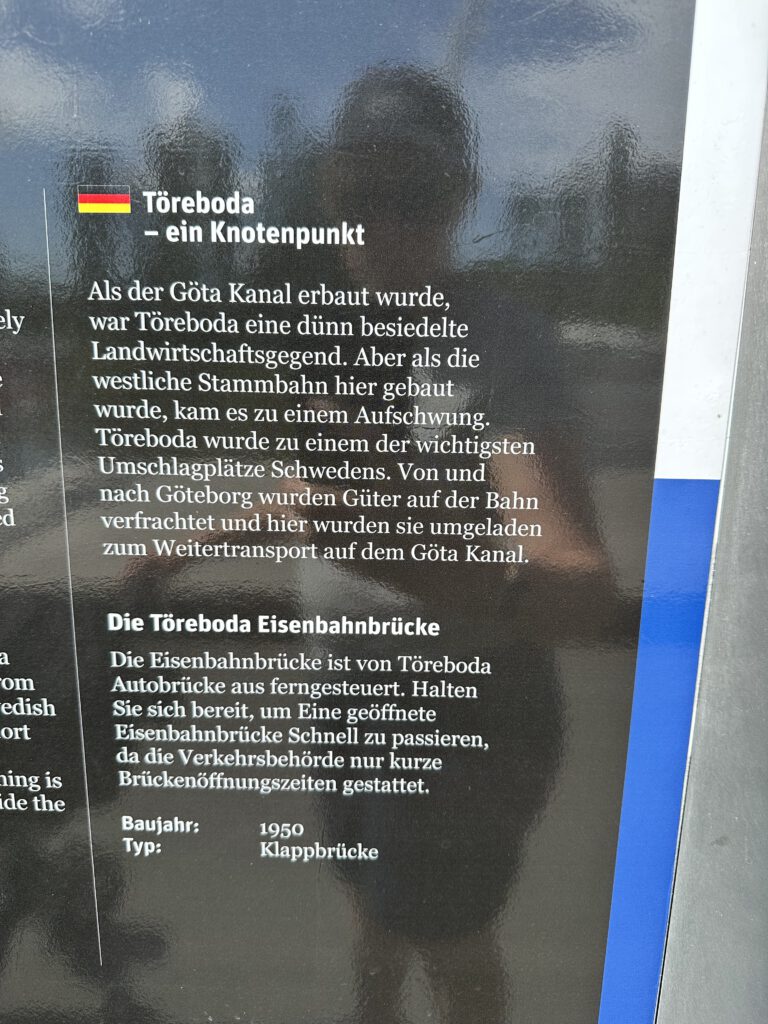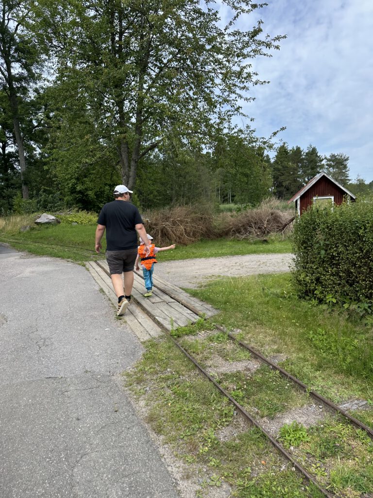 Schade, das war anders geplant. Nach einiger Zeit warten beschließen wir, zur Forsvik Bruk zu kaufen, keine 10 min vom Hafen entfernt. Hier laufen auch kleine Gleise vom Hafen bis zum Industriegelände und die beiden großen Männer sind fleißig dabei, die Weichen umzustellen und haben großen Spaß daran. Der Eisenbahnschuppen steht offen und so schauen wir uns um und sind etwas traurig, mit solch einer Bahn nicht fahren zu können, zumal noch Fahrtpreise dranstehen Vermutlich veraltet.