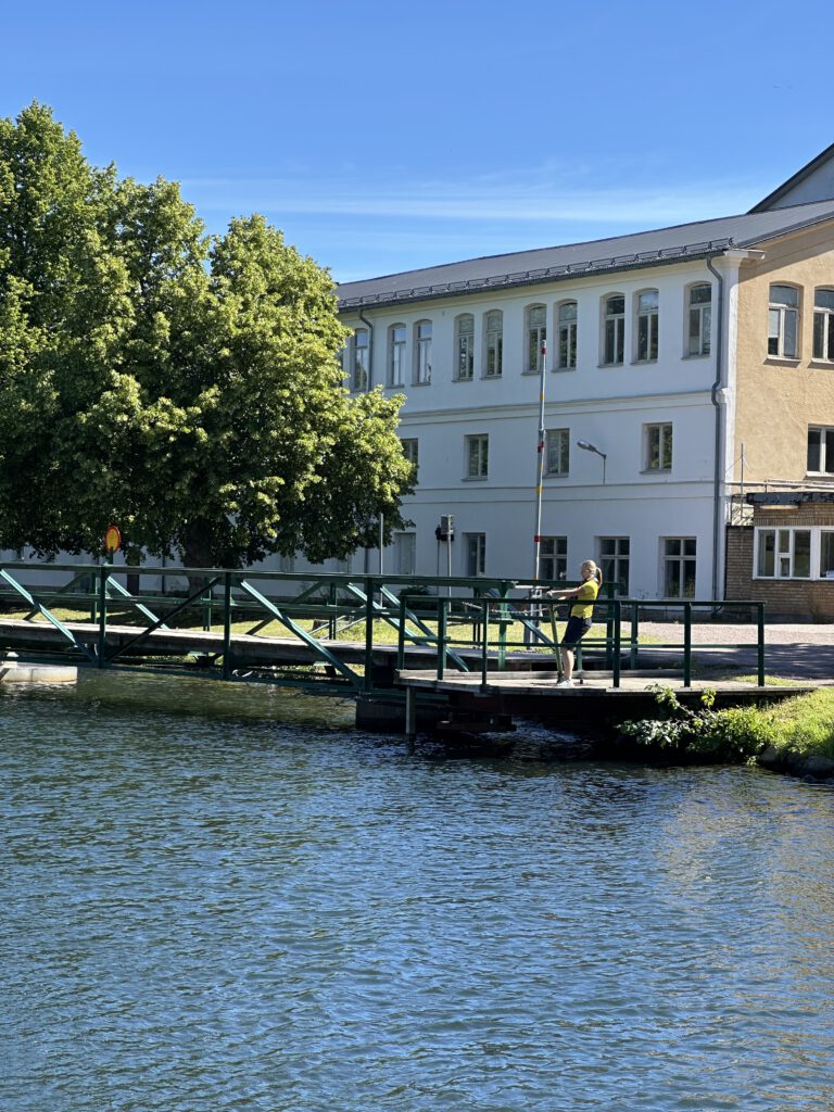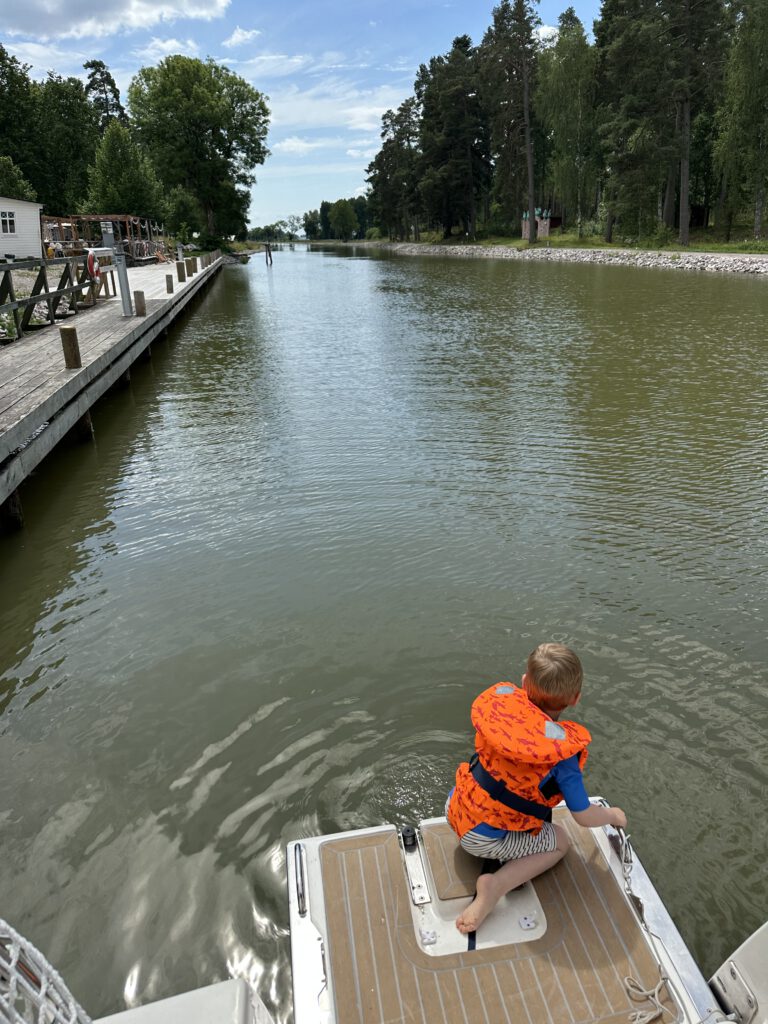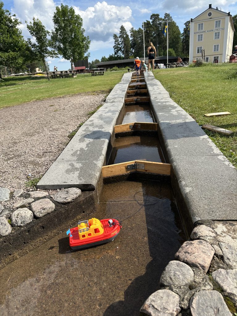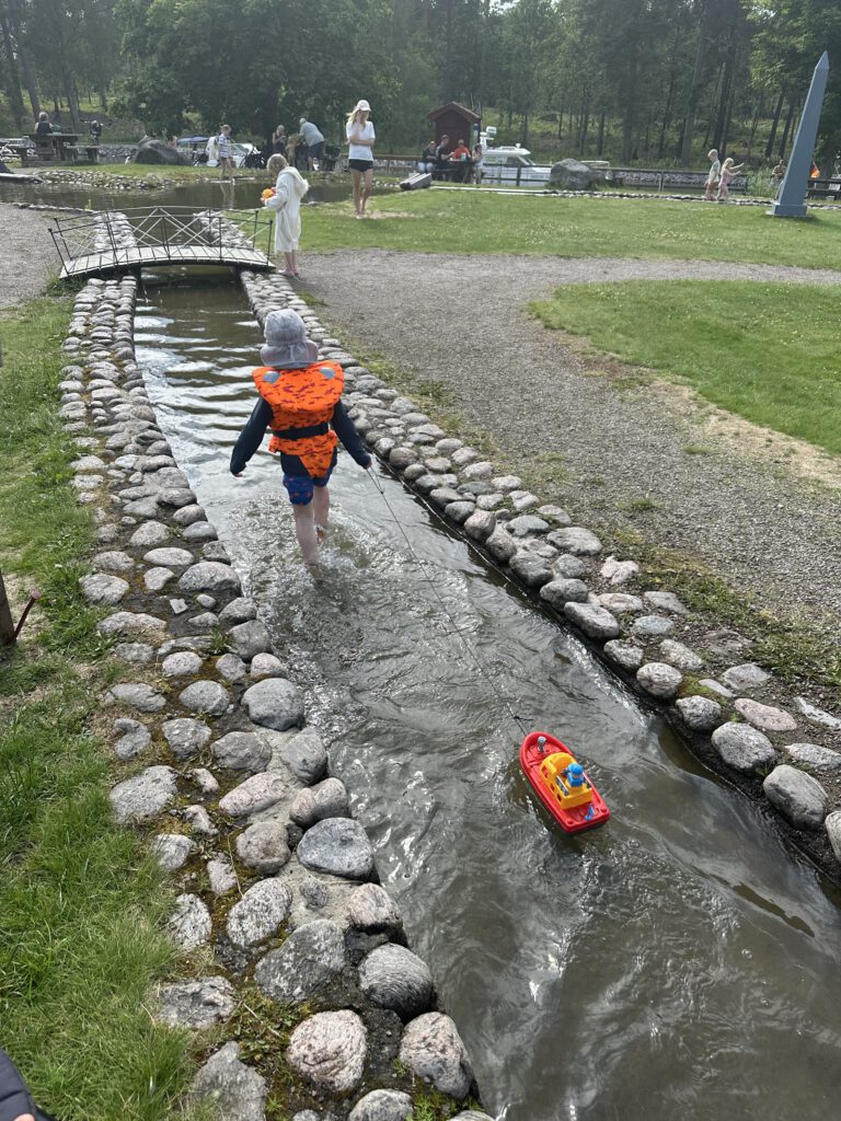 Wir kommen gegen Mittag in Norrqvarn an und nach der Mittagsruhe heißt es direkt: Badesachen an und ab zum Minikanal (dieser liegt ca. 20 m vom Steg entfernt ;-). Zum Glück wussten wir vorab davon und hatten ein Boot mitgenommen bzw. in Kalmar gekauft. Ansonsten können hier die Kinder auch Boote zum Spielen ausleihen. Dieser Minikanal des Göta Kanals ist ein absolutes Highlight für die Kinder am Göta Kanal. Bei den derzeitigen Temperaturen von ca. 24 Grad C (kaum Wind, die Wärme staut sich eher) ist das kühle Wasser des Kanals eine schöne Abkühlung für die Kids.