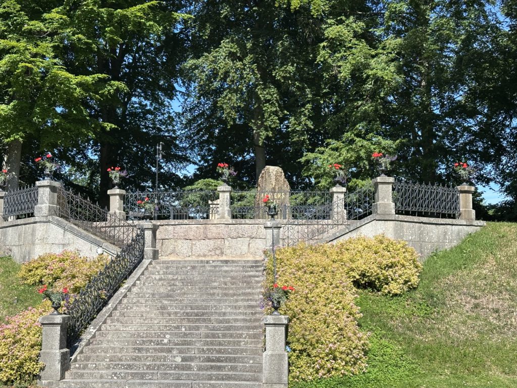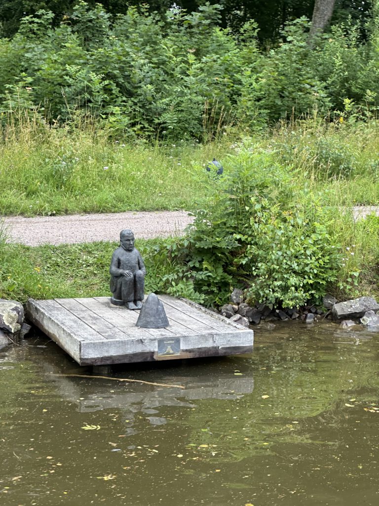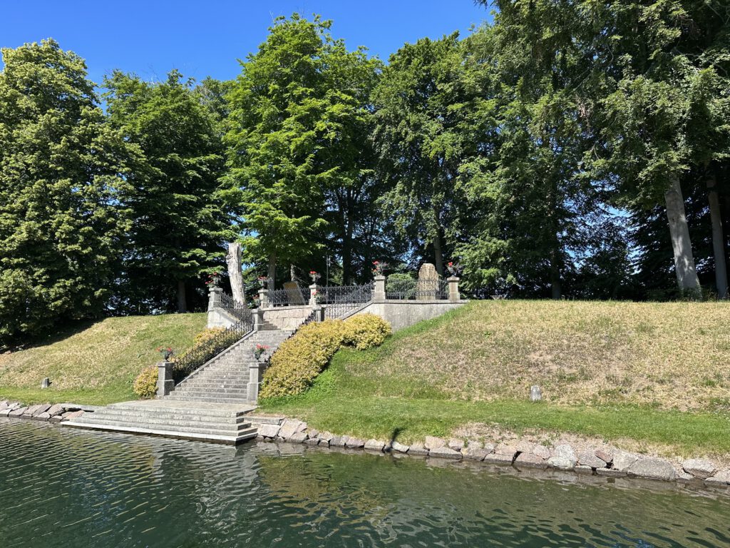 Heute gehts noch bis zu einem Naturarm des Göta Kanals, in dem man an einem Holzsteg festmachen kann, in der Nähe des Denkmals (siehe Foto) – hinlaufen trauen wir uns nicht, das Gras wächst ungefähr hüfthoch und wir scheuen Zecken und Co.