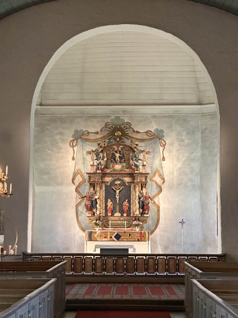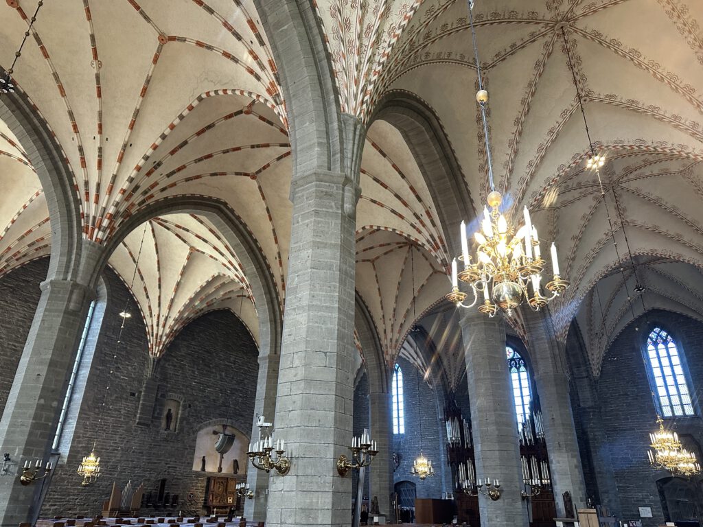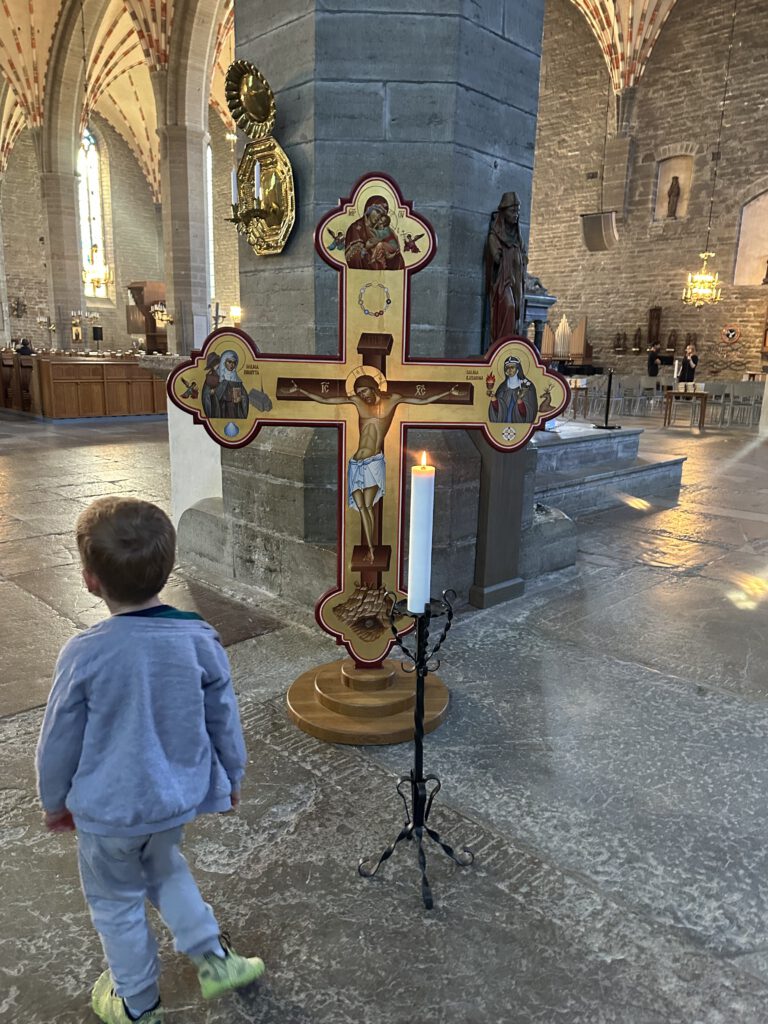 Die Klosterkirche gefällt uns sehr gut, sie ist beeindruckend. Hier fällt uns nun endlich auf, dass es scheinbar zum Konzept der schwedischen Kirche gehört, stets eine Kinderecke mit Büchern, Maltisch o.Ä. zu haben – egal wie klein die Kirche ist. Hier gibt es neben beidem Genannten auch zwei große Körbe mit Kuscheltieren. Ich kann mir vorstellen, dass die Kirche so zu einem Ort auch für Kinder wird. Wieso wohl die deutsche Kirche solch ein Angebot nicht macht? So richtig können wir es uns nicht vorstellen, dass die Spielsachen wirklich dauerhaft an Ort und Stellen verbleiben würden, gleichzeitig ist die deutsche Gesellschaft keine besondere kinderfreundliche, in unseren Augen.