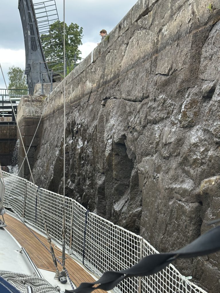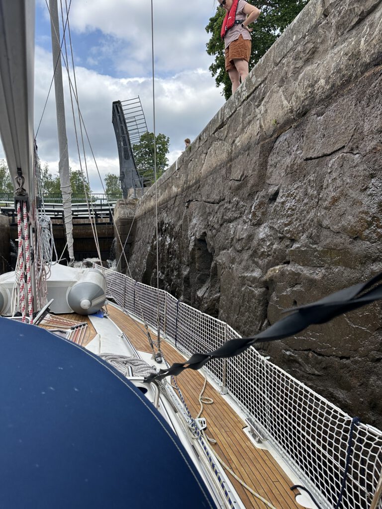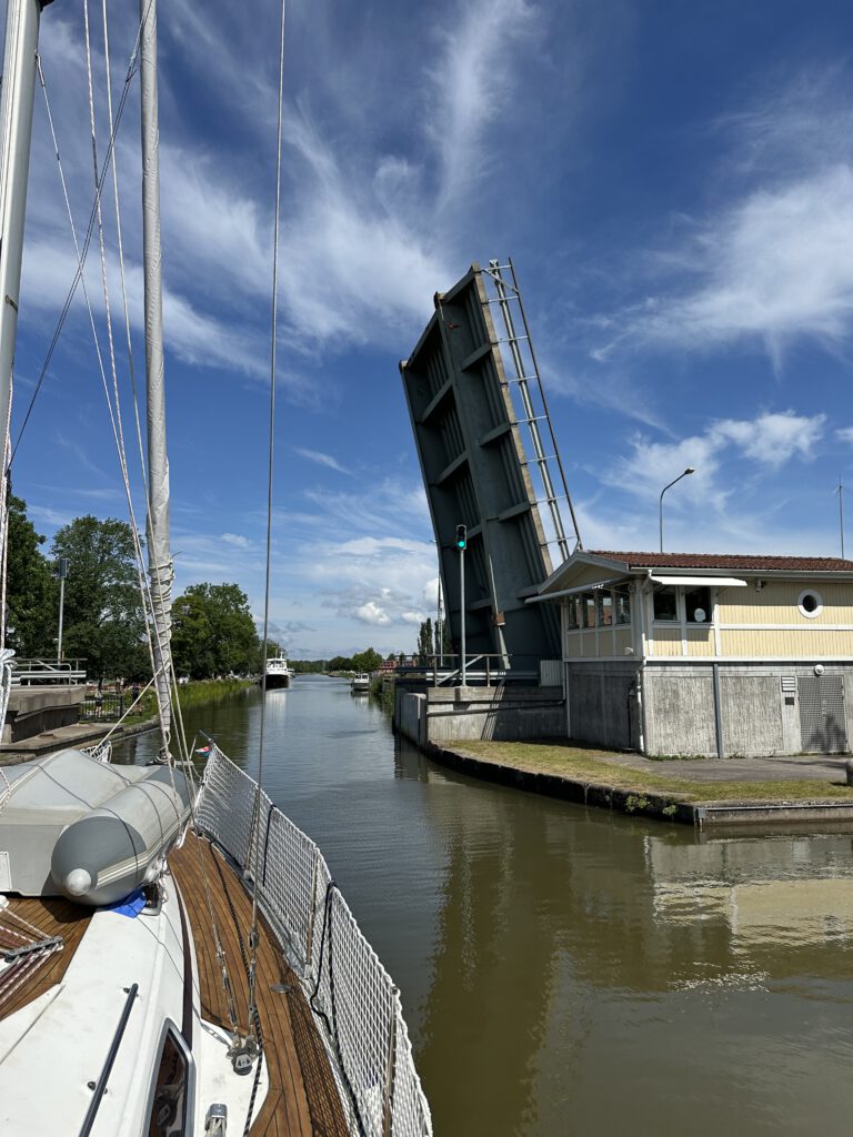 Zu Beginn versuchen wir noch zu segeln, dann wären wir aber sehr langsam und wir möchten heute noch durch die geöffnete Brücke und dann noch zur Festung Karlsborg. Diese ist heute eher eine Militäranlage.