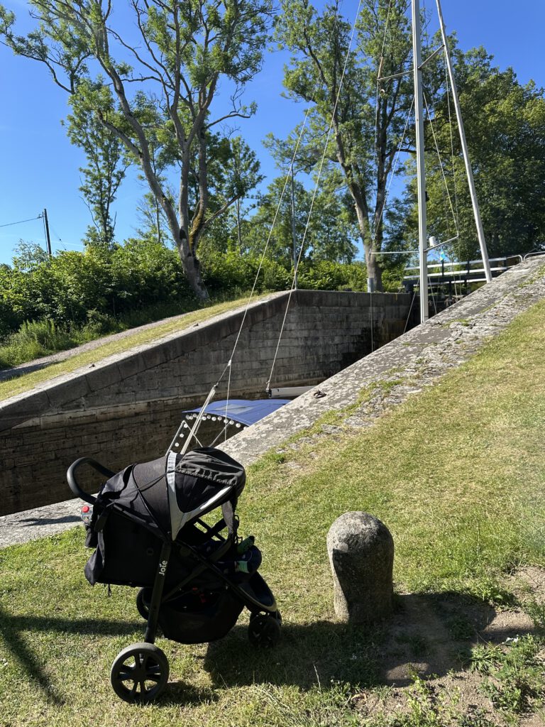 Morgens fahren wir kurz nach der Schleusen- und Brückenöffnung los und passieren drei Doppelschleusen und eine Dreierschleuse bergabwärts. Das ist gar nicht ohne, aber auch diese meistern wir wieder gut. Es zeigt sich, dass das Schleusen mit guter Vorbereitung (Winschen, Leinen, Kinder) und guter Kommunikation keine große Hürde bedeuten muss – bei gewissen Temperaturen aber natürlich dennoch anstrengend ist.
