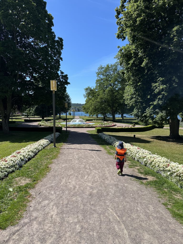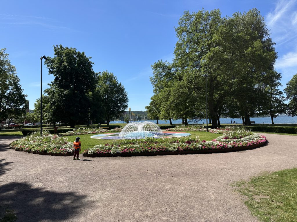 In 5 min Laufnähe befindet sich in einem schönem Park mit tollen Springbrunnen ein ganz toller Spielplatz, der super viel bietet, sogar einen Wasserspielplatz. Ich gehe mit beiden Kindern hin bei 25 Grad und den ganzen Tag Sonne; nach der Mittagsruhe gehen wir nochmal hin und nehmen Paul mit, nachdem wir uns ein Eis gegönnt haben. Heute ist ein echter warmer Sommertag!
