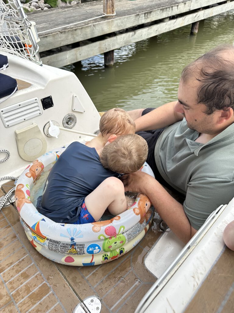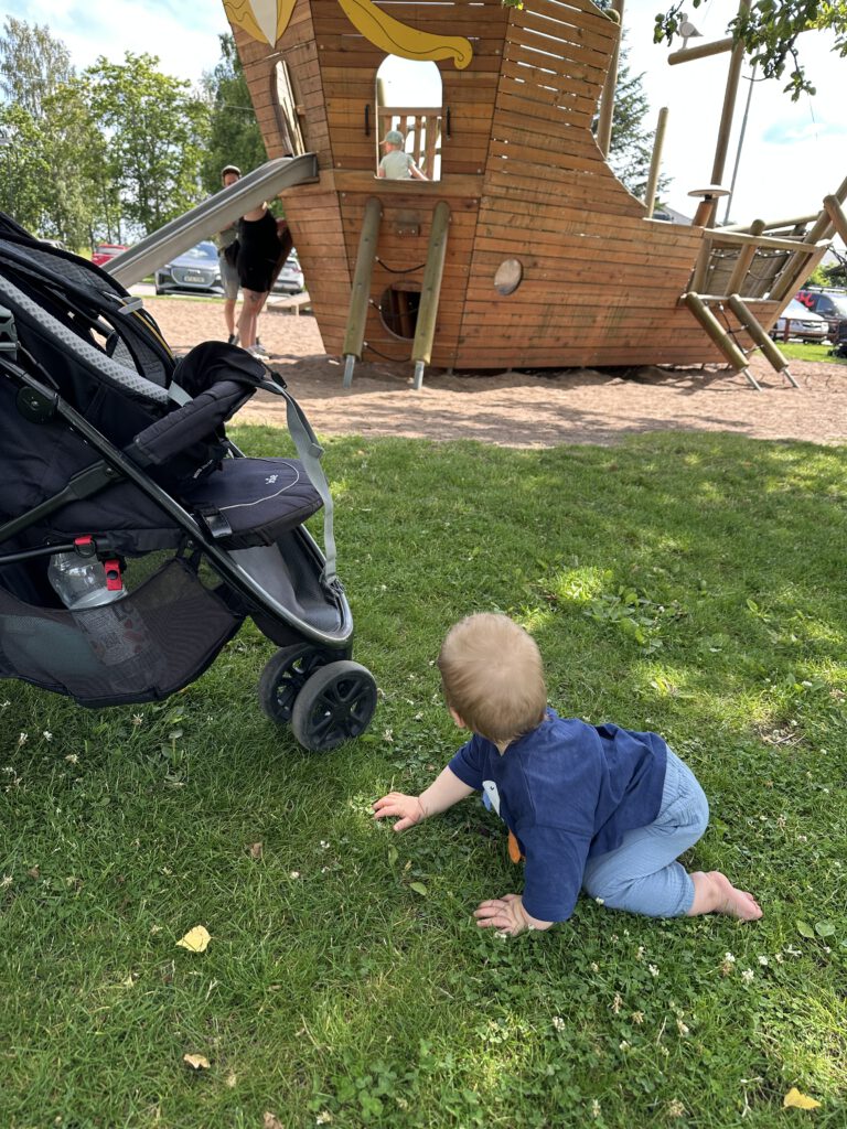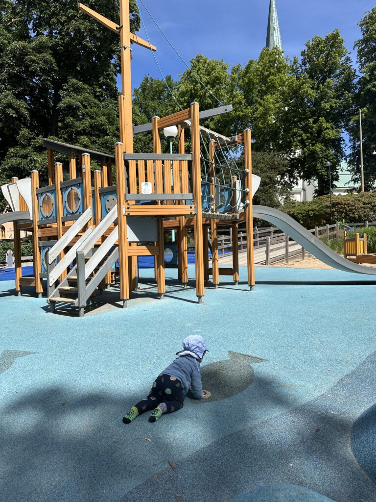 Am Nachmittag gehen wir etwas in die sehr nah gelegene „City“ und entdecken den schönen Ritterburgspielplatz (wie passend!) und Paul und Kapitän Wirbelwind gehen bei gut 27 Grad Sommerwetter noch an der kleinen Badestelle gegenüber von unserem Schiff baden, während der Mini Matrose und ich eine Krabbelsession auf der Liegewiese machen.