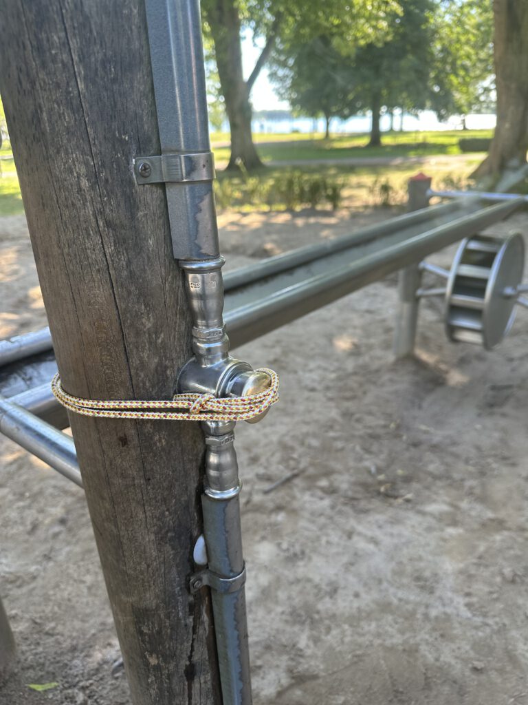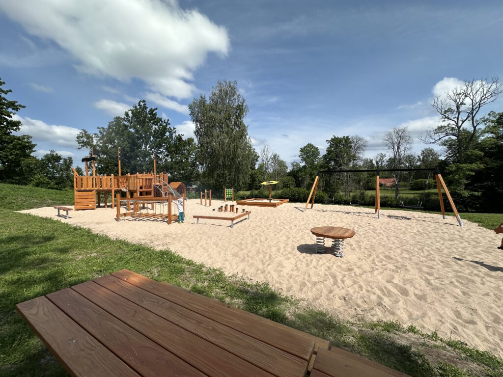 Auf dem Rückweg sprechen wir mit dem Shcleusenwärter, er meint, wir könnten noch eine knappe Stunde zur Einfahrt der Schleuse kommen mit dem Schiff, danach erwarten sie erstmal ein Passagierschiff und es gäbe eine Pause für Sportboote. Daher machen wir nur einen kurzen Abstecher auf den komplett neu gebauten Spielplatz und fahren dann los.