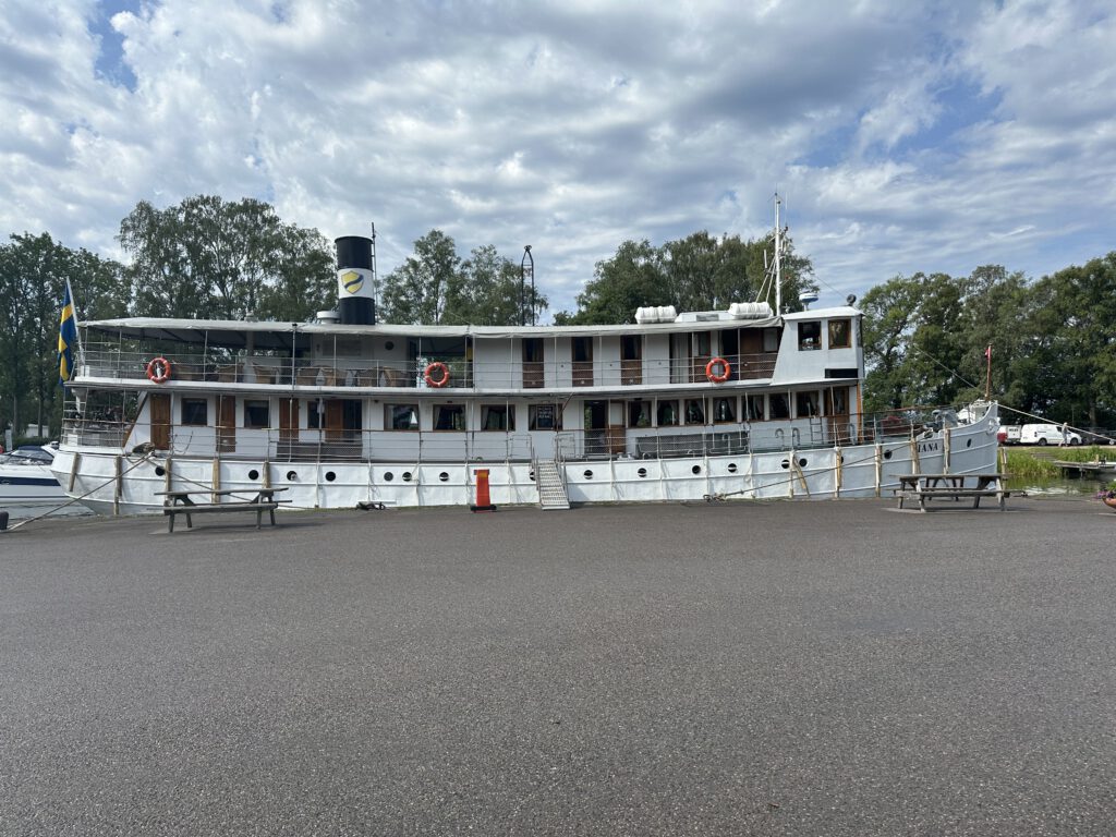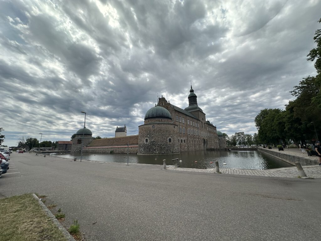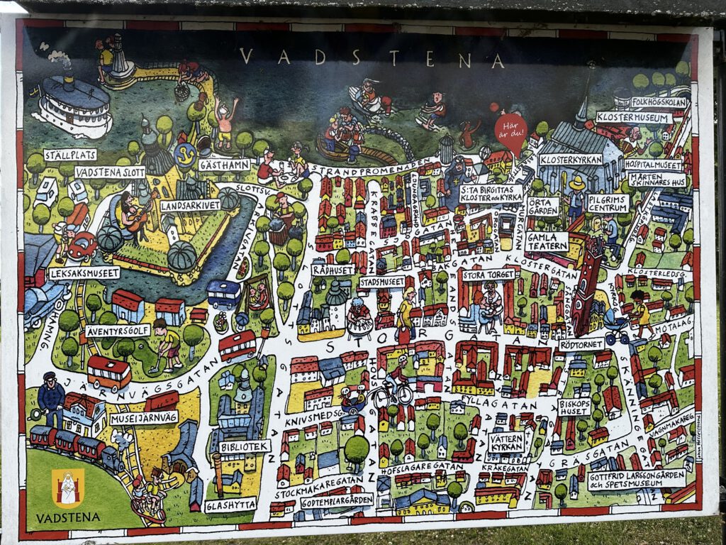 Wir legen gegen 8 Uhr in Motala ab, heute sollen 27 Grad werden. Wir wollen an einen nahe gelegenen Strand ankern und mit dem Beiboot rüberfahren zum Baden und Buddeln. Am Morgen ist es jedoch noch sehr trüb, und so ändern wir den Plan spontan und fahren direkt nach Vadstena, wo wir gegen 10 Uhr ankommen.