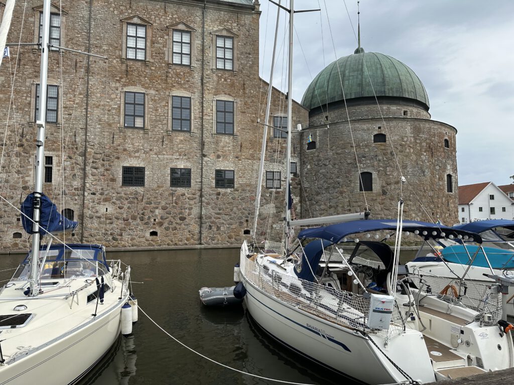 Der Hafen ist sehr gut aus allen Windrichtungen geschützt und wir fahren bis ans Ende, denn hier gibt es eine Möglichkeit festzumachen, wie man sie wohl nur sehr selten findet: direkt im Schlossgraben vor dem Schloss Vadstena!