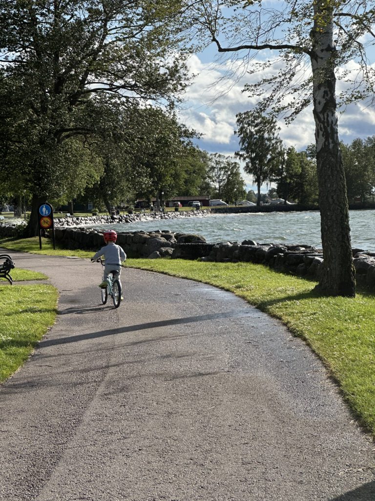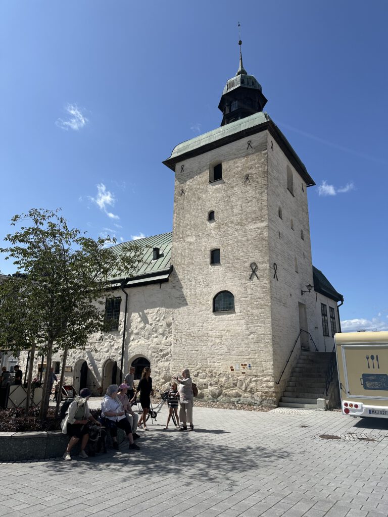 Heute sind wir mittags noch mal auf dem Spielplatz und nach der Mittagspause fahren wir (naja, eigentlich Kapitän Wirbelwind) mit dem Kinderfahrrad zur Klosterkirche Vadstena. Diese hatten wir bereits beim Ansteuern von Fasten am gestrigen Tage gesehen und für besuchenswert eingeschätzt.