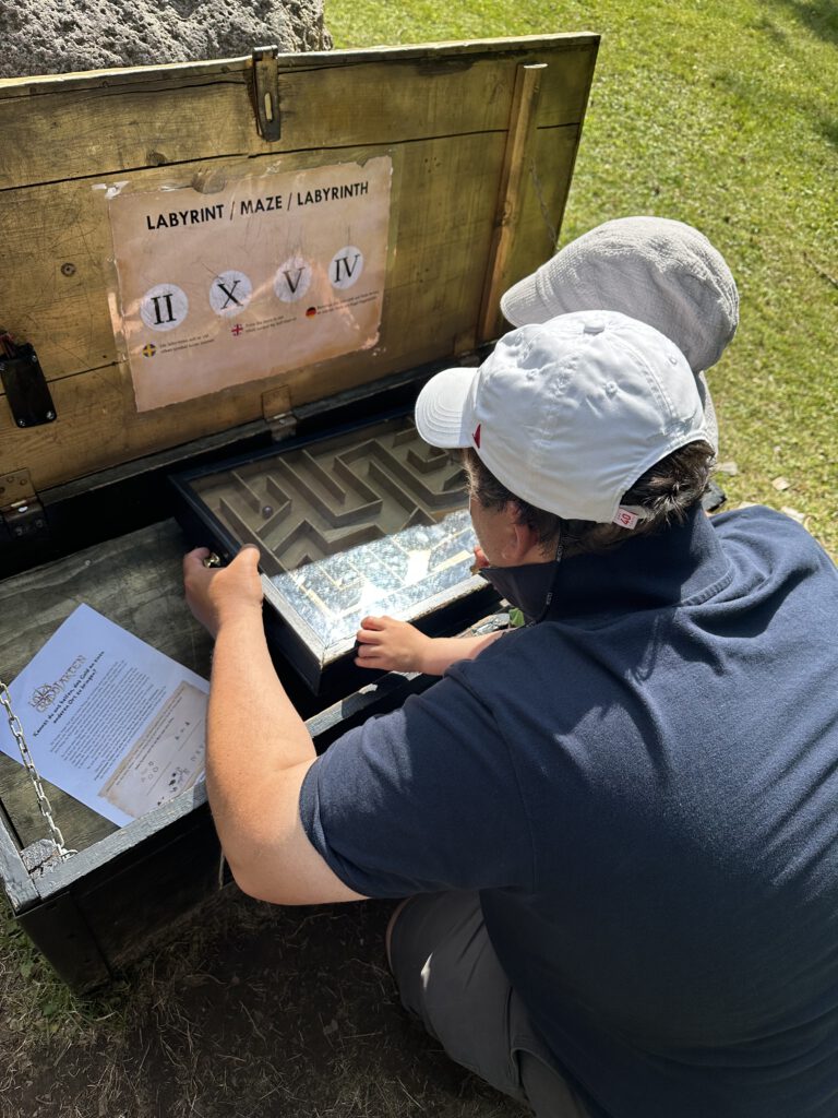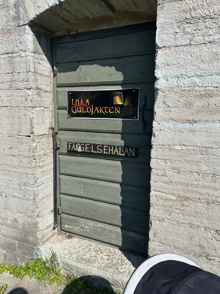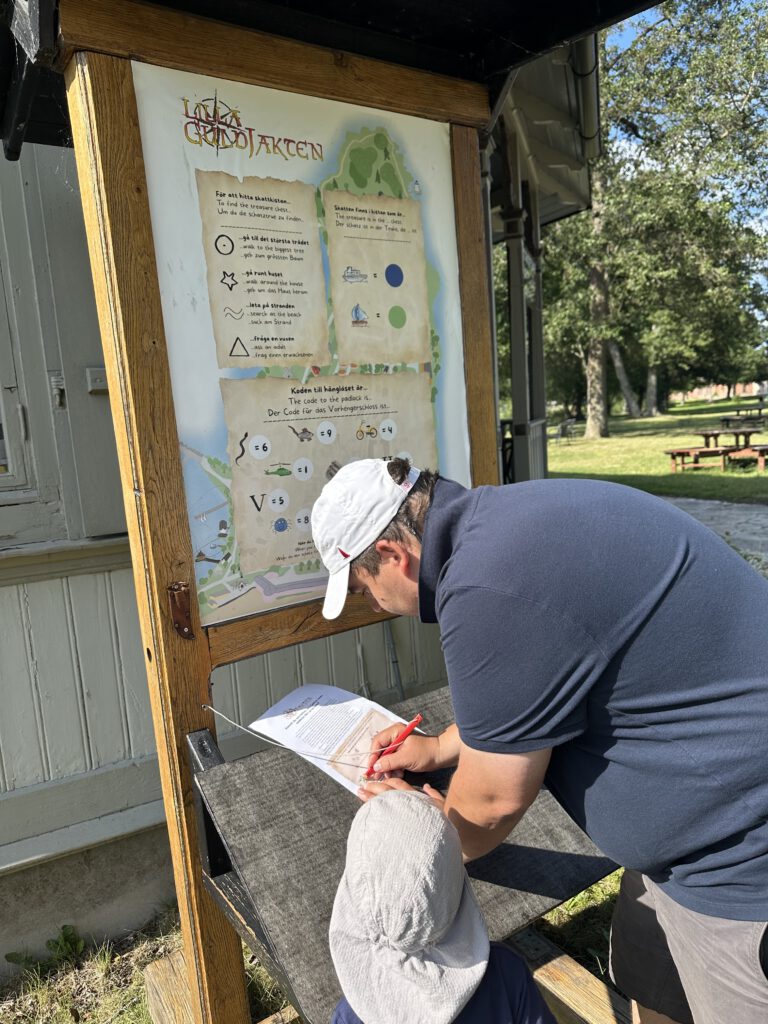 Dieses Häuschen kann als Sauna gemietet werden – 3 h kosten 1300 SEK. (Stand 11.Juli ca. 116 EUR, es passen aber auch einige Leute rein)Hängematten und ein Bücherschrank mit schwedischen Kinderbüchern, dank Google Translate kein Problem, Paul liest mehrere Bücher vor =)Eingang zur FestungEingang zum Museum, wo wir dann nicht reingehenDie SchatzkarteAuch in einer düsteren Kammer musste ein Rätsel gelöst werden!