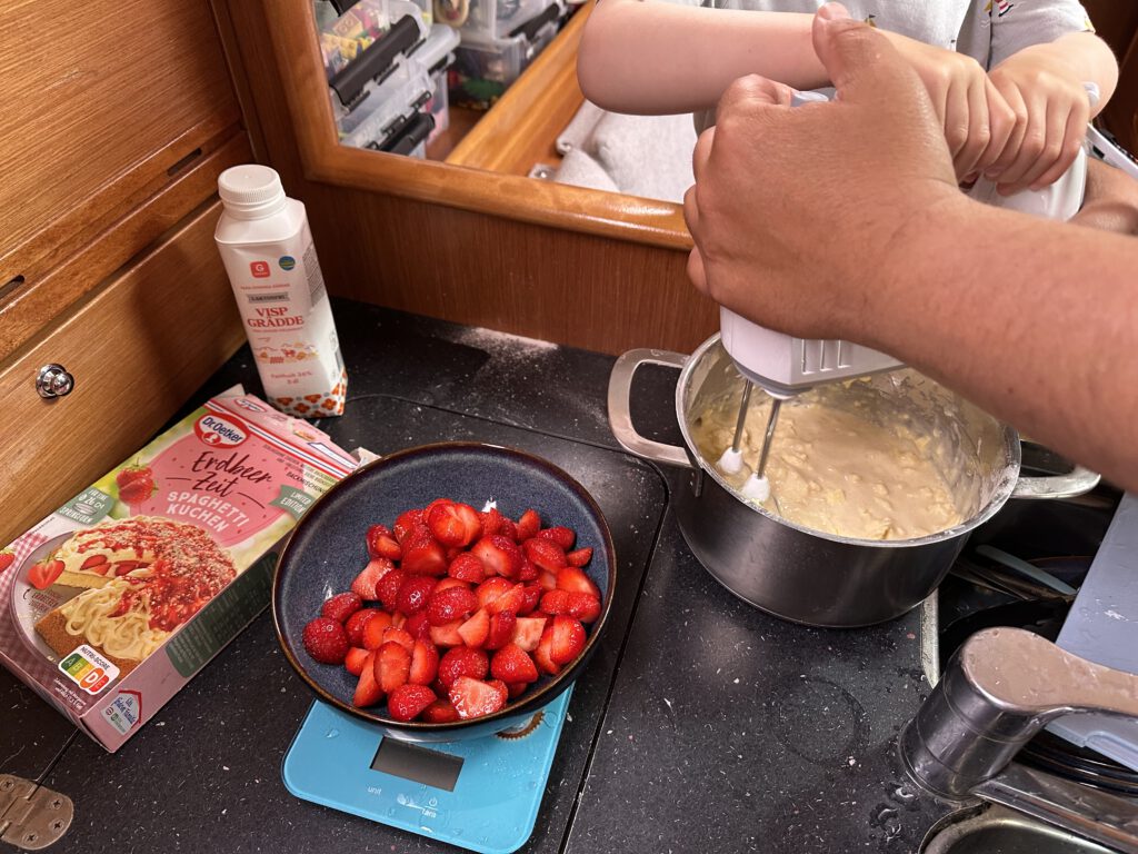 Zu diesem Bergfest backen wir einen Spagetti-Erdbeer-Kuchen, an wir wir mit drei 2,5 Personen 3 Tage lang zu essen haben.