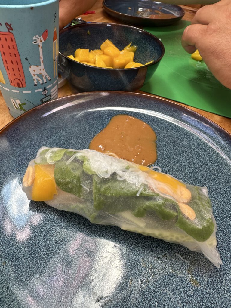 Heute ist es mit 23 Grad C sommerlich warm und wir essen mit leckeren Sommerrollen, für die ich im Supermarkt noch schnell Mango kaufen gehe, ein tolles Gericht für warme Tage – Kapitän Wirbelwind ist auch sehr angetan.