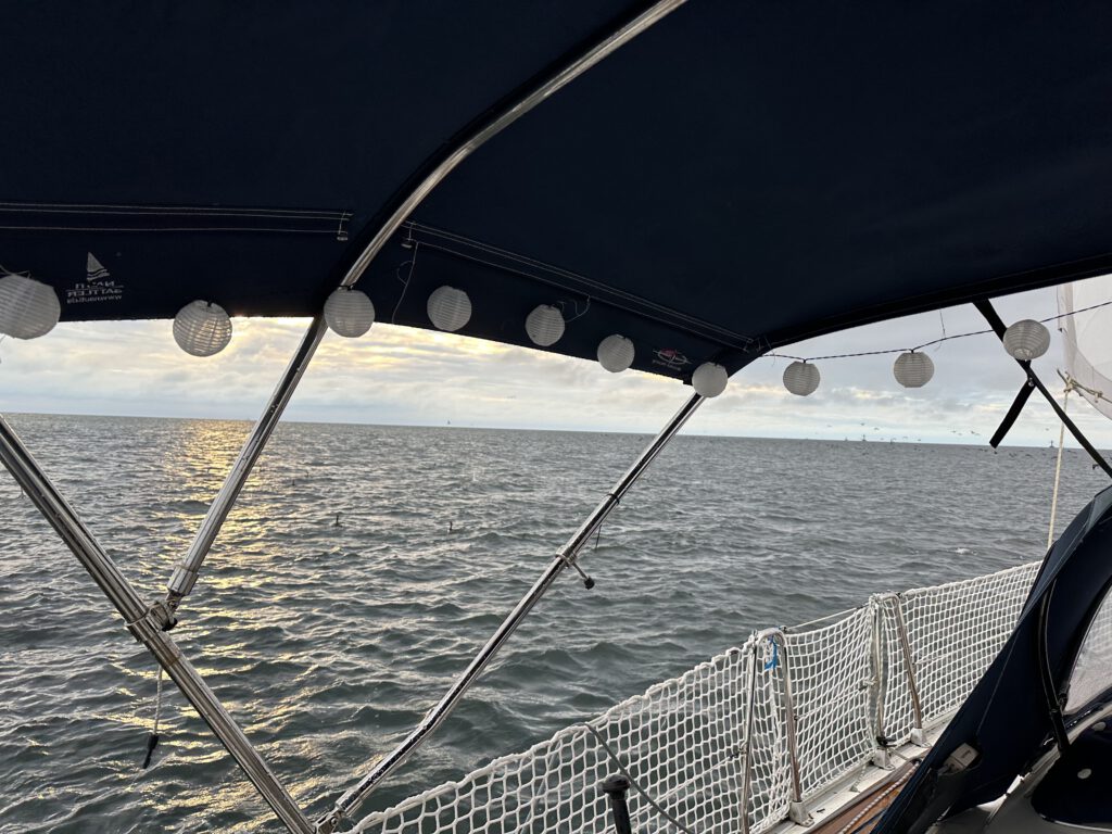 Der Abend, als die Kinder schlafen, wird teilweise sehr stürmisch und der Wind pfeift durch die Masten. Wir beide nutzen die kuschelige Atmosphäre (na immerhin wenn man drinnen ist) und schauen einen schönen Film zusammen. Seltenes Vergnügen, meist verbringen wir die kurze Abendzeit zusammen mit Geschirrspülen, Segelroute mit Wetter besprechen, Wäsche zusammenlegen oder aufräumen vom Tag. Oder eben mit dem Schreiben des Blogs, was aber daher nicht jeden und auch nicht jeden zweiten Tag klappt.