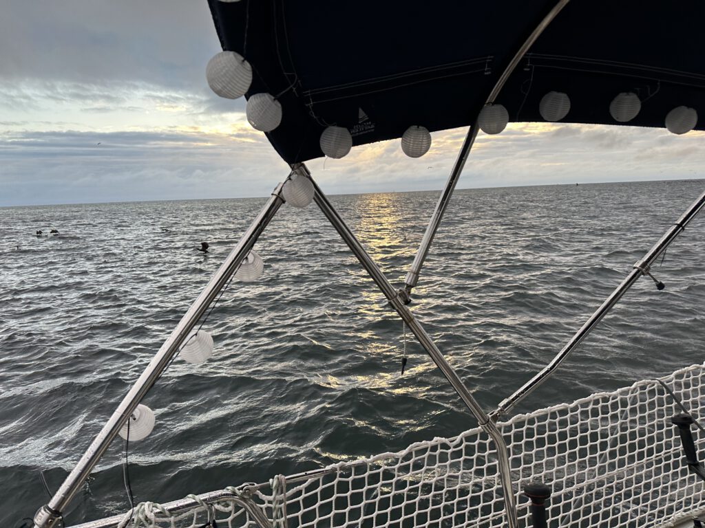 Wir sind heute mal wieder recht lange unterwegs und es ist sehr bedeckt, wir sehen heute kaum Sonne. Es ist zeitweise recht schaukelig und wir sind mit über 8 Knoten Geschwindigkeit echt schnell, haben zeitweise aber auch gut Welle von vorne, sodass das Schiff ordentlich zu stampfen hat.