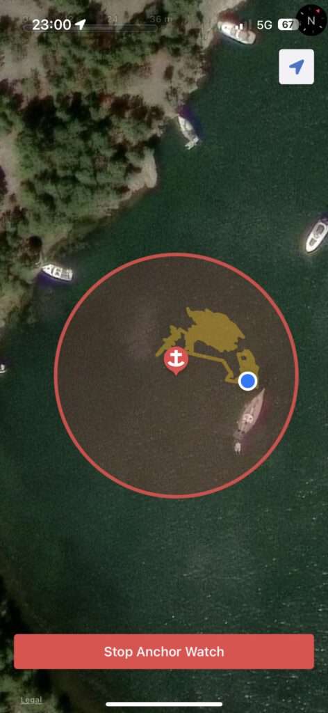 Ein Letzter Blick des Tages auf die Anker-App. Der Anker hält. Zeit ins Bett zu gehen.