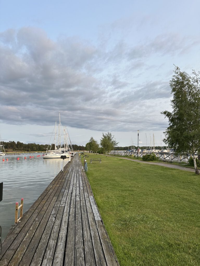 Der Hafen ist noch ziemlich leer, er wird bei unserem nächsten Besuch in einigen Tagen sicherlich schon voller sein – insbesondere weil wir den nächsten Besuch über Midsommar planen. Zunächst legen wir vorwärts an, es gibt eine Heckboje, an der wir mit einer Heckleine festmachen. An Land kommt man so nur über das Klettern vorbei am Vorstag, auf den Anker und rückwärts runtersteigen. Leider ist hier das Land sehr tief- eine gute Gelegenheit für unseren alten Plastikhocker, den uns die Voreigner des Schiffes mitgegeben hatten.