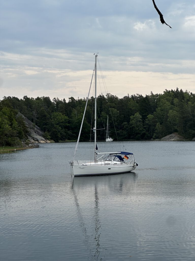 Gegen 15 Uhr kommen wir in der Ankerbucht von Ägnö an, es liegen schon einige Schiffe hier, wir sind die einzigen Nicht-Schweden. Es ist Sonntag und viele nutzen das traumhafte Wetter für einen Sonntagsausflug raus aus der Stadt, rein in die Schärenidylle. Grillen, baden gehen (es scheint niemanden zu stören, wie kalt das Wasser eigentlich ist…), auf bzw. am Wasser sein. Was gibt es Schöneres!?