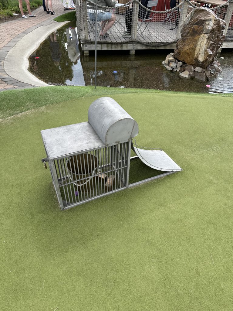 Letzte Bahn- am Ende landen die Bälle immer in einem Eimer oder einem Rohr, von wo sie dann von den Betreibern wieder eingesammelt werden zum Tagesende, so muss man den Ball nie zurückbringen und jeder Spieler hat seinen eigenen.