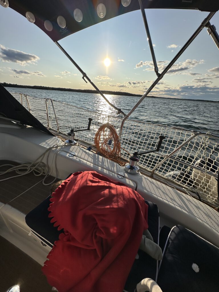 Kapitän Wirbelwind ist fix und fertig und schläft bei Paul in der Plicht während es Segelns ein, es ist heute aber auch ein super entspannter Segelabend mit seichtem Wind und viel Geplätscher.
