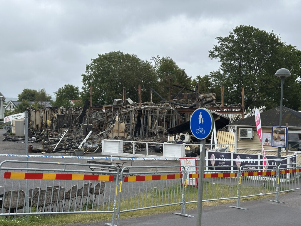 Heute ist es windig und regnerisch. Am Vormittag laufen die Kinder und ich zu dem kleinen Supermarkt im Ort und sehen an einer der Schleusen, die wir noch vor uns haben, ein abgebranntes Ausflugsgasthaus. Das muss ein bis zwei Tage zuvor passiert sein. Sieht heftig aus und stinkt noch sehr unangenehm. Dies war laut Kanalführer eine Restaurantempfehlung. Schade!