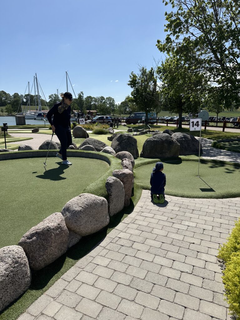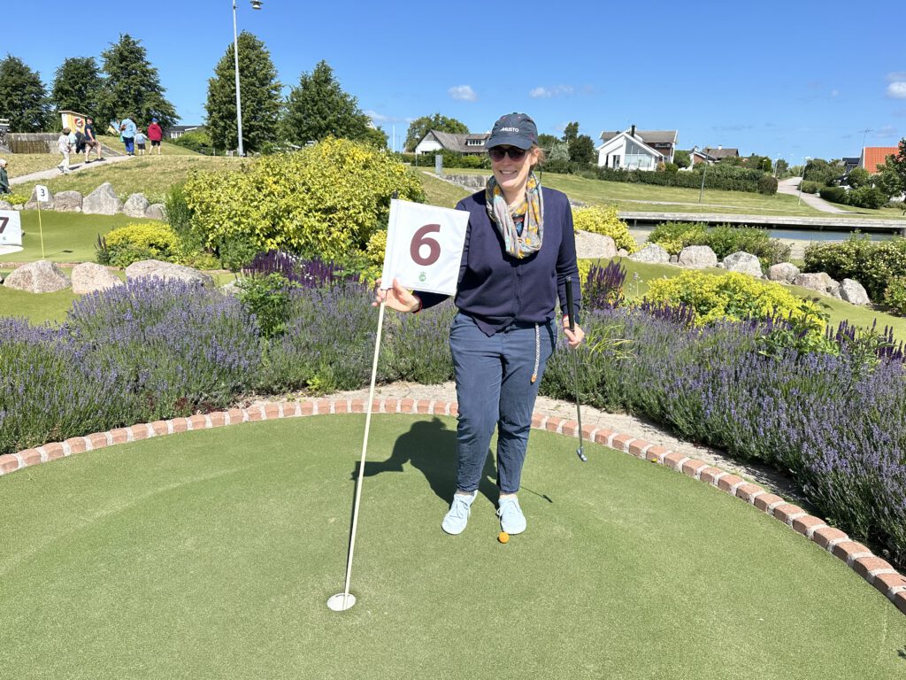 Heute soll es noch windiger, teils sogar stürmisch werden – dafür ist aber auch viel Sonne angesagt. Am Vormittag gehen wir die paar Schritte zum Abenteuer-Minigolf. Die Bahn haben wir fast die ganze Zeit für uns. Es gibt hier nicht nur zwölf, sondern ganze 18 Bahnen. Wir haben viel Freude beim Spielen und liefern uns wieder ein Kopf-an-Kopf-Rennen. Kapitän Wirbelwind möchte heute zum ersten Mal alleine spielen. Bisher hat immer einer von uns mit ihm zusammen den Abschlag gemacht. Trotzdem hat er bisher tatsächlich jedes Spiel gewonnen – wie das möglich ist, ist uns bis heute ein Rätsel.