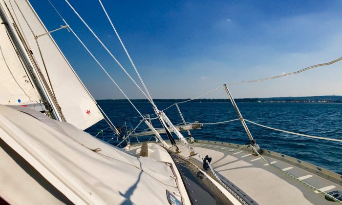Wir wurden so manches Mal gefragt: „Was dauert da eigentlich so lange, was arbeitet Paul denn am Boot?“ Nun, neben den normalen Winterarbeiten (Deck putzen und vom Laub befreien, Unterwasserschiff streichen, Rumpf säubern und polieren, …) kamen nun Verbesserungen/Optimierungen für die Reise hinzu, wie z.B. der Umbau eines Kleiderschrankes (von Stange zu Fächern mit Teakholz), der Einbau eines Regals in die Backskiste für die Schaffung von Ordnung (diese ist sehr groß, ohne gezielte Aufbewahrungsmöglichkeiten fliegt spätestens bei Krängung beim Segeln alles dort durcheinander – von der Grillkohle zum Klapprad), der Optimierung der Wassertanks an Bord (Wasser zum Abwaschen etc., nicht trinken), den Einbau eines Autopiloten (es war einer vorhanden, jedoch war dieser mit seiner Aufgabe regelmäßig überfordert – die Folge war ständiges Neukalibrieren und dennoch zu spätes Reagieren bei Fahrt unter Segeln oder Motor – und dazu war er auch bei jedem Steuern krächzend laut), der Einbau weiteren Stauraums im Küchenschrank, die Ausstattung an Bord mit verschließbaren Kisten (Lebensmitteln, Babykleidung, Kosmetik – also fast alles, geschützt vor Feuchtigkeit, gut stapelbar und direkt zu identifizieren da durchsichtig) sowie das Nähen und Einpassen eines Lee-Segels für das Bett in der Achterkajüte und einiges mehr.
