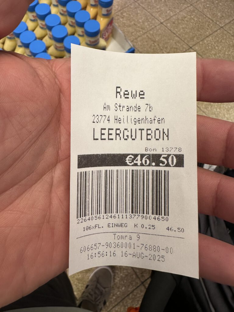 Wir wollen heute noch die deutschen Wasserflaschen zum Pfandautomaten bringen.