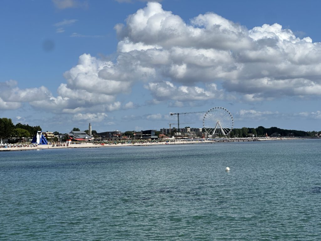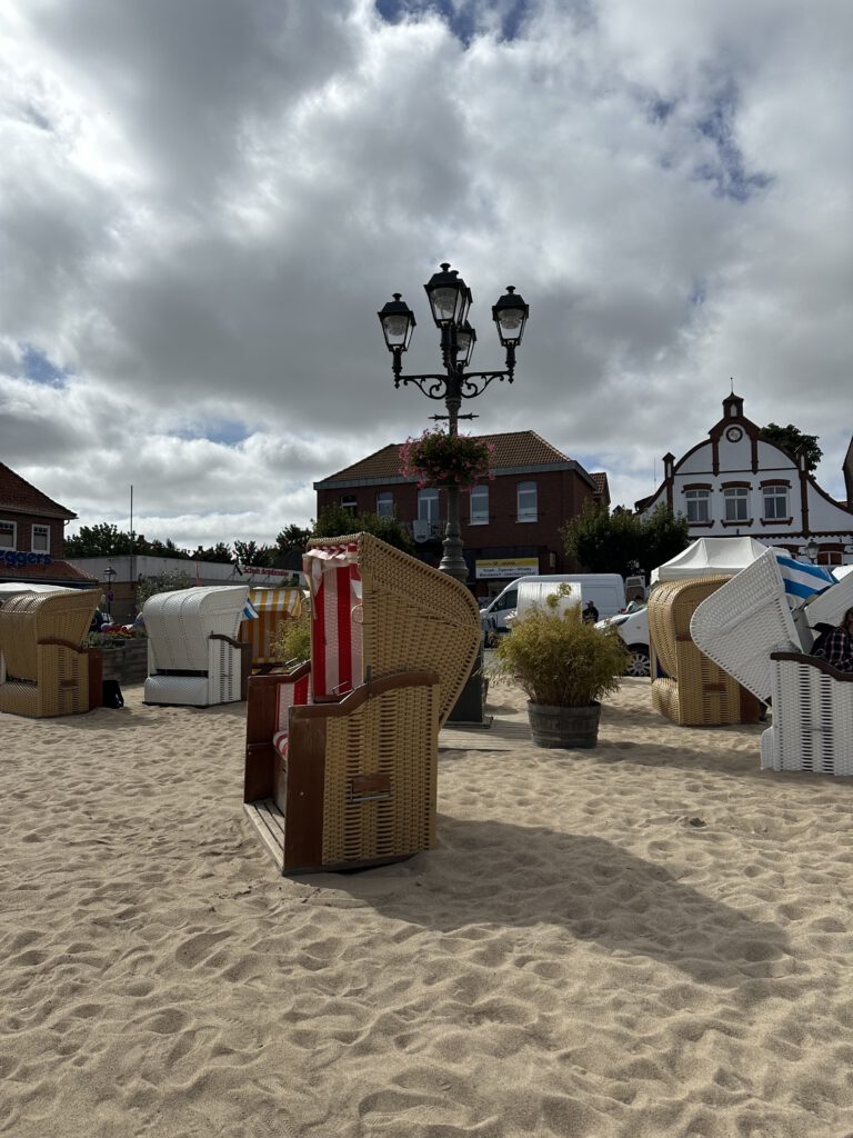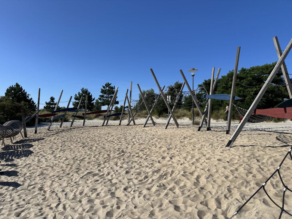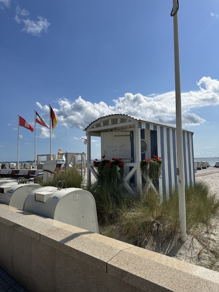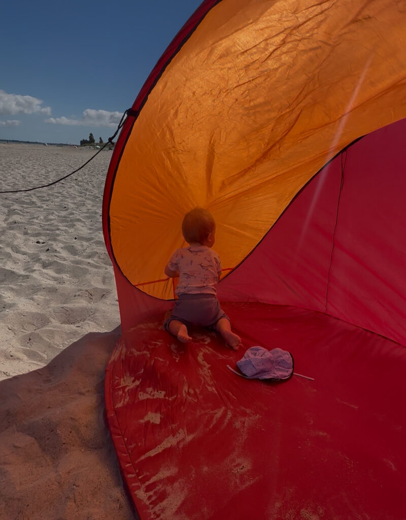 Heute passt endlich das Wetter und wir gehen vormittags an den Strand- an den Abschnitt, der am Hafen liegt und nicht an der Seebrücke. Wir sind direkt um kurz vor 10 Uhr da und außer uns sind vielleicht noch 3 Leute da. Interessanterweise, obwohl alles leer ist und die volle Wahlfreiheit bezüglich eines Platzes besteht, baut tatsächlich jemand seine Strandmuschel etc. 3 m hinter uns auf. Ich tippe mal, weil er mit seiner Partnerin gestern schon an diesem Platz lagen? Wir sind echt wieder zurück in Deutschland… oh Mann! Dafür kann ich aus der näheren Entfernung beobachten, was er für verschiedene Matten dort hineinlegt, wo der Sand hindurchfallen kann und ihre Liegen/Matratzen bewundern, die man trotz fehlendem Gestell anklappen kann für eine halbliegende Nutzung. Also ich fühle mich gut unterhalten! Wir genießen die Zeit am Strand bei dem gutem Wetter sehr und hauen gegen halb 12 dann ab, als die anderen Strandbesucher ihre Handtücher beginnen auszubreiten.