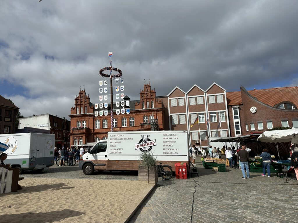Am frühen Nachmittag kommen wir in Neustadt in Holstein an. Wir entscheiden uns für den Stadthafen, von wo aus man gut zu Fuß in die Stadt kann und welcher für den morgigen Ausflug einen optimalen Ausgangspunkt bildet. Viele Plätze sind als belegt gekennzeichnet für große ältere Schiffe, die aber nur teilweise im Laufe des Abends noch ankommen. Dafür stehen um uns herum an dem einzig möglichen Liegeplatz dauernd Angler die ihr Glück versuchen. Wir gehen noch kurz in den Ort hoch und entdecken eine sehr gute Idee Eisdiele (eine Kugel zu 1,60€!), wo wir uns noch etwas mitnehmen.