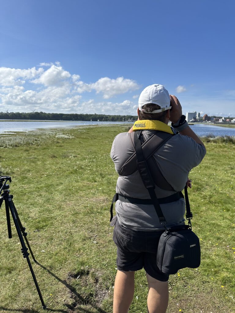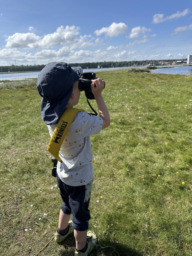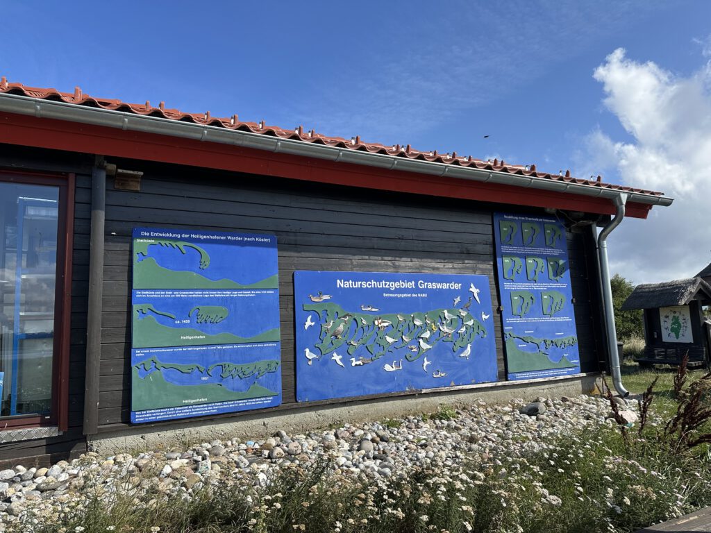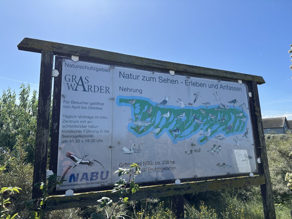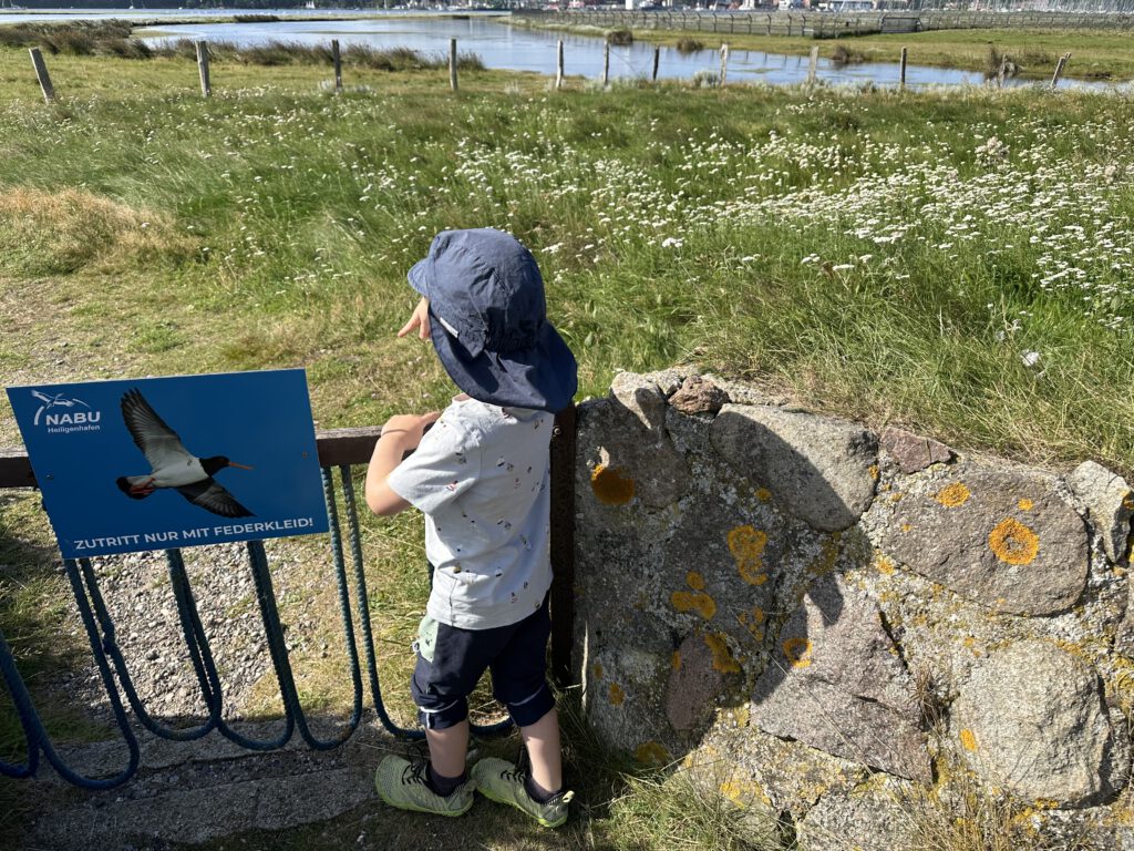 Ich hatte bei Maps gelesen, dass der NABU auf Graswarder im Sommer zweimal täglich Führungen und Vogelbeobachtungen anbietet. Wir waren nun schon so häufig in Heiligenhafen und auf Graswarder, dass wir gern etwas erfahren möchten über die Flora und Fauna hier. Die Führung geht ganze 2 Stunden und das ist schon das äußerte mit zwei kleinen Kindern. Der Führer ist hier ehrenamtlich tätig und studierter Biologe, leider wirklich nicht sympathisch- heute war sein letzter Tag (ihre Einsätze gehen immer 2 Wochen am Stück und dann kommt jemand Anderes), vielleicht war er auch nur erschöpft von den 14 Führungen, die er in kurzer Zeit gegeben hatte. Wir lernten einiges über die Pflanzen hier, er klärte uns, dass die Hundsrose (Rosa canina), die nahezu jeder mit der Ostseeküste in Verbindung bringt, eigentlich nicht hierhergehört ( und invasiv ist) und andere Pflanzen überwuchern kann und damit eine Gefahr für die einheimische Flora darstellt. Wir beobachten sogar einen Grünschenkel mit dem Ferngas, welches wir mitgebracht haben (man kann sich sonst auch vom NABU welche ausleihen), dieser ist wohl nicht sehr häufig während der Führungen zu sehen. Der Führer erzählt, wie der Mensch in die Natur eingreift, Lebensräume begrenzt und der Tourismus immer mehr Raum einnimmt und Müll hierherbringt.