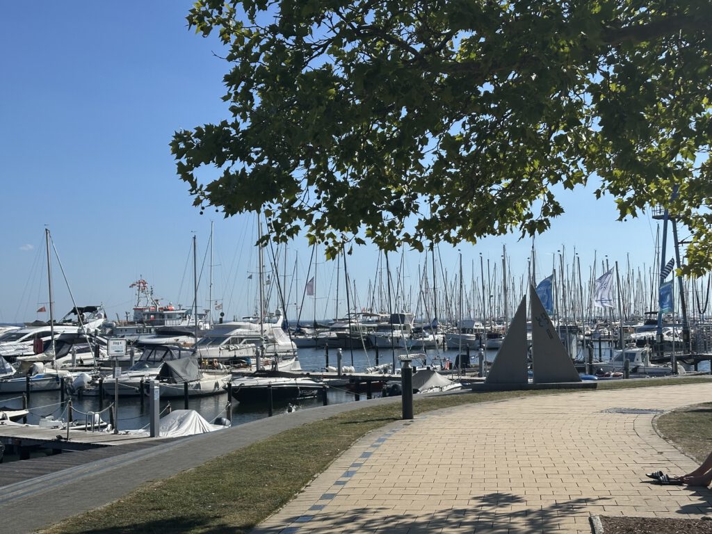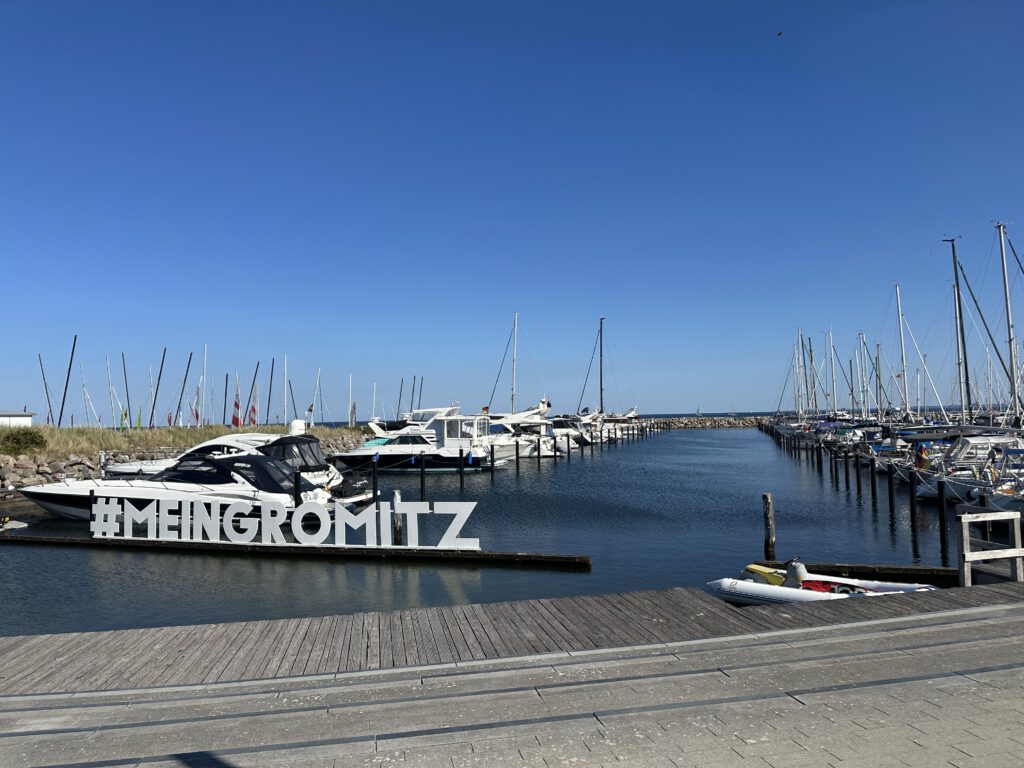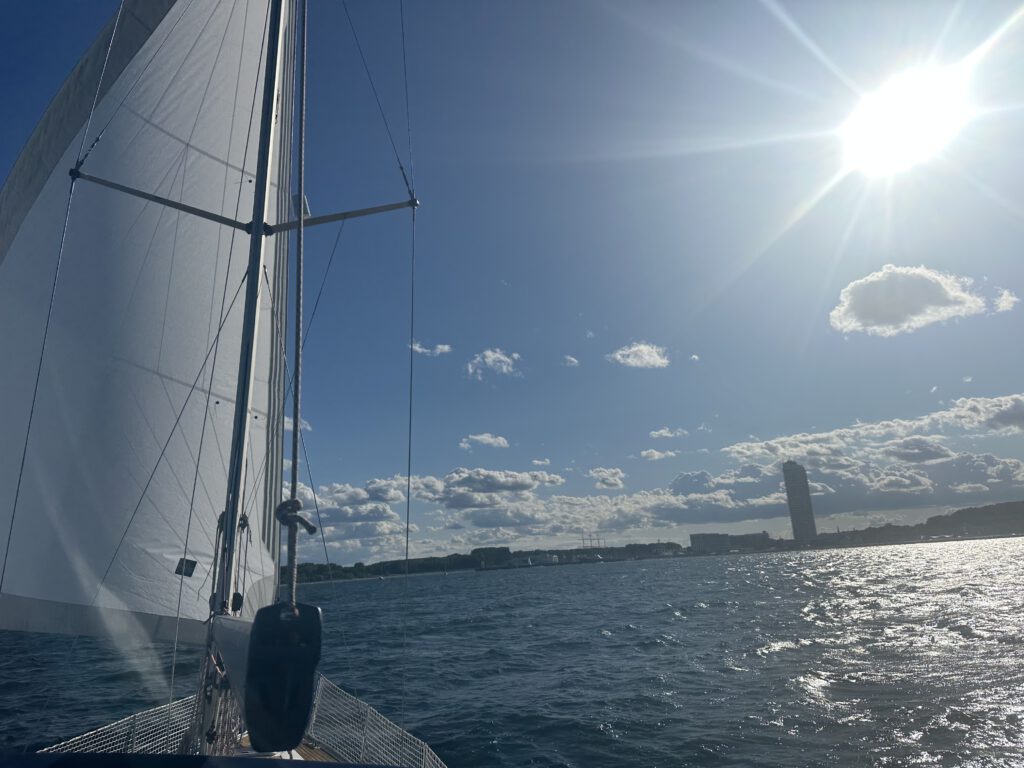 Die Überfahrt von Heiligenhafen nach Grömitz verläuft dann sehr sehr entspannt, der Wind pustet uns von Achtern in das Seebad Grömitz, welches die vielleicht längste Promenade und Sandstrand hat, die und den wir je gesehen haben.