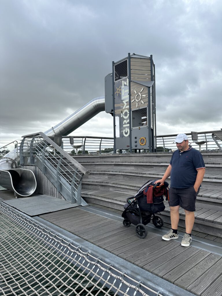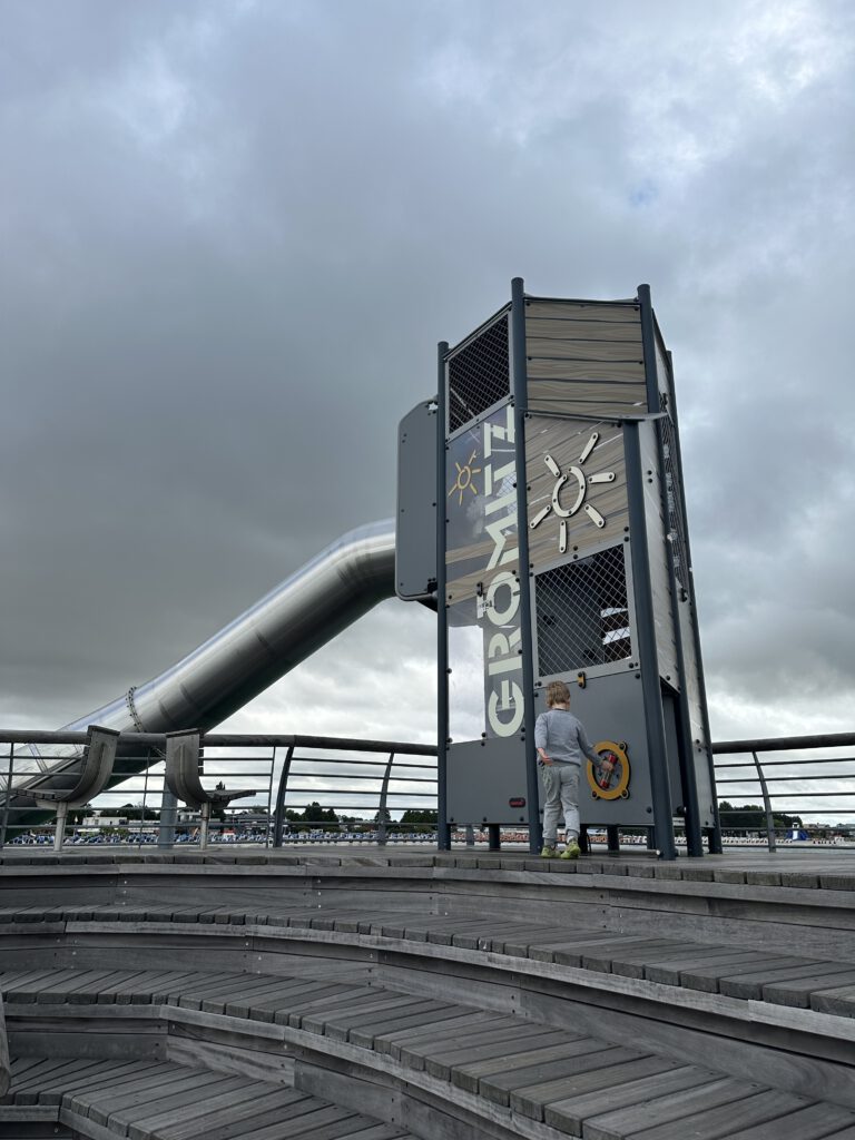 Nachmittags gehen wir etwas über die Promenade schlendern, gehen auf den Spielplatz am Hafen (Kapitän Wirbelwind kennt ihn schon vom letzten Jahr) und wir gehen zur Seebrücke, wo es eine kleine Rutsche und einen Wasserspielplatz (man pumpt Meereswasser nach oben indem man ein großes Hamsterrad durchläuft und am Ende fließt das Wasser dann wieder ins Meer zurück) gibt.