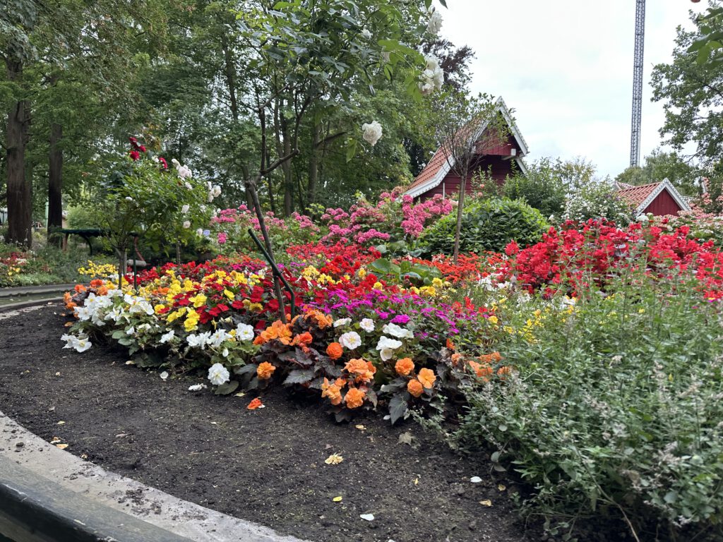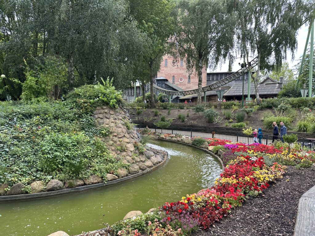 Paul startet gleich mit einer großen Runde: „Flucht von Novgorod“ – eine beeindruckende Achterbahn, aber natürlich nichts für die Kinder. Danach steigen wir alle zusammen in kleine Boote, die durch schön angelegte Blumenbeete gondeln. Ein sanfter Einstieg.